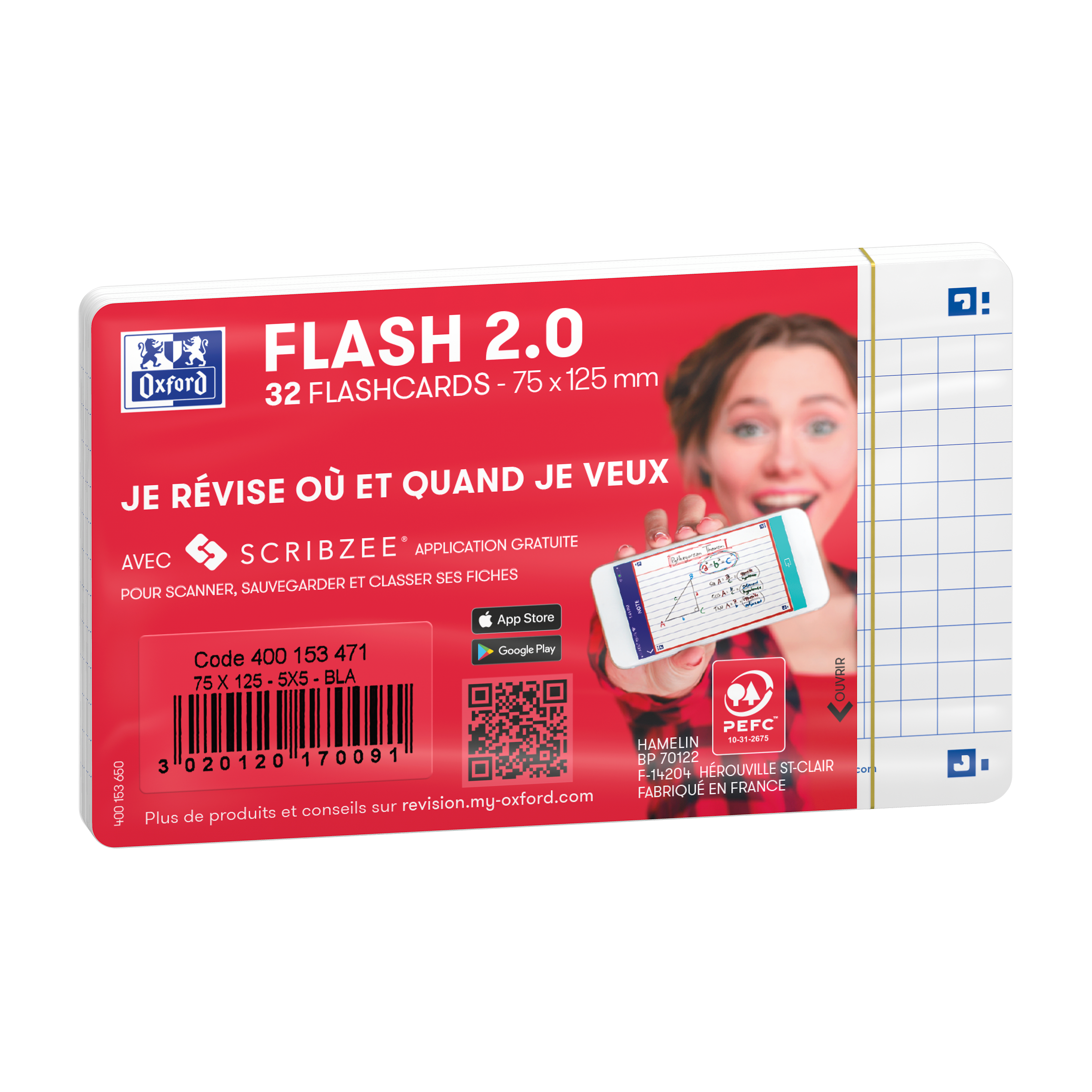 A l'approche d'examens importants, qui n'a jamais rêvé que réviser soit plus fun et plus efficace ? Les flashcards FLASH 2.0 vous aideront à mémoriser efficacement définitions, formules ou langues étrangères. Les flashcards sont un outil de mémorisation simple et ludique pour assimiler un grand nombre d'informations par cœur. Notez une question au recto et sa réponse au verso et testez-vous régulièrement sur une période de temps espacée pour une mémorisation à long terme. Et c'est encore plus efficace grâce à l'application gratuite Scribzee® ! Scribzee® sauvegarde vos flashcards FLASH 2.0 dans le cloud et vous propose un mode Révision et un mode Quiz pour vous entraîner et réviser à tout moment, partout et depuis tous vos appareils connectés. Avec la nouvelle génération de flashcards FLASH 2.0, vos révisions seront vraiment motivantes ! Ces fiches sont proposées en pack de 32 fiches, format 7, 5 x 12, 5 cm et réglure petits carreaux. Elles sont fabriquées en France.