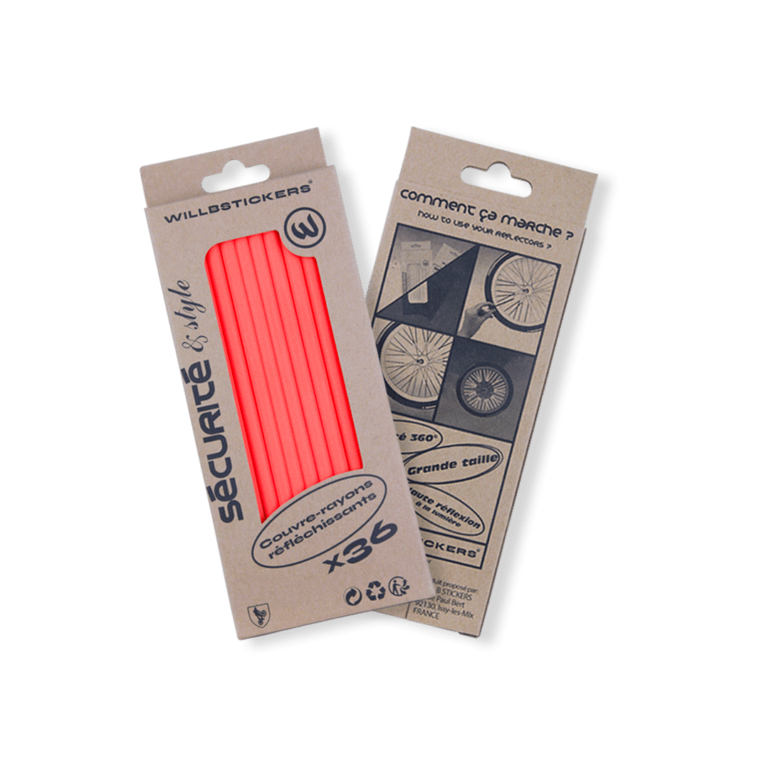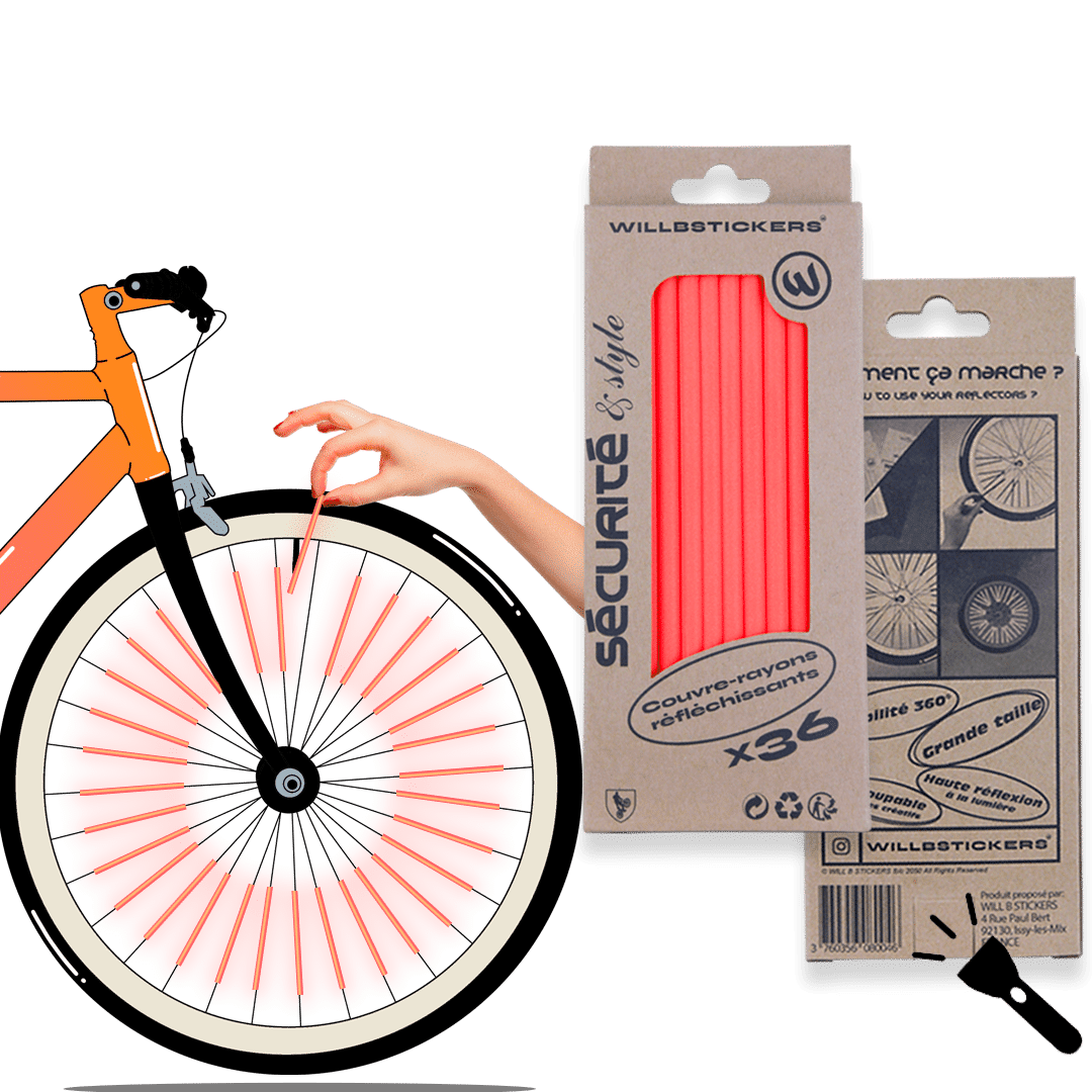 Nos couvre-rayons ultra réfléchissants et multi-couleur ! Restez visible à vélo Il est important d'être visible sur la route. Avec nos couvre-rayons réfléchissants, les automobilistes et piétons ne pourront pas vous louper. Doté d'un revêtement rétro-réfléchissant dernière génération cet accessoire est indispensable pour sécuriser vos trajets. Profitez de notre large gamme de couleur pour personnaliser votre vélo à votre image. Les avantages de nos réflecteurs: Grande taille : 15cm. Pack de 18 ou 36 réflecteurs de rayons. Packaging en carton éco-responsable sans plastique ni encre toxique. Facile d'installation. Peut-être découpé pour laisser place à votre imagination. Certification haute visibilité : Norme EN 20471 Réflecteurs universel pouvant s'adapter à tout type de rayons : vélo de ville, vélo pliant, BMX, VTT, Cargo, fauteuil roulant, remorque. Comment marche nos réflecteurs de rayons? Une fois votre pack en main, il suffit de sortir les couvre-rayons réfléchissants et de les clipser sur vos rayons de jante. Pour cela les réflecteurs disposent d'une fente. Insérez votre rayons, écoutez:" CLIPS" et le tour et joué ! Laissez place à votre imagination en disposant vos couvre-rayons de manière originale. Si vous avez une âme d'artiste vous pouvez également les découper pour multiplier les combinaisons. Une fois installés les couvre-rayons ne bougent plus et ne font pas de bruit. Ils vous offre une visibilité 360° de jour comme de nuit. @willbstickers