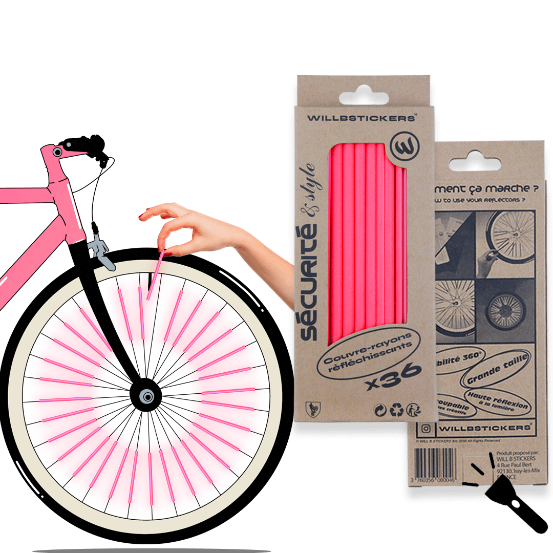 Nos couvre-rayons ultra réfléchissants et multi-couleur ! Restez visible à vélo Il est important d'être visible sur la route. Avec nos couvre-rayons réfléchissants, les automobilistes et piétons ne pourront pas vous louper. Doté d'un revêtement rétro-réfléchissant dernière génération cet accessoire est indispensable pour sécuriser vos trajets. Profitez de notre large gamme de couleur pour personnaliser votre vélo à votre image. Les avantages de nos réflecteurs: Grande taille : 15cm. Pack de 18 ou 36 réflecteurs de rayons. Packaging en carton éco-responsable sans plastique ni encre toxique. Facile d'installation. Peut-être découpé pour laisser place à votre imagination. Certification haute visibilité : Norme EN 20471 Réflecteurs universel pouvant s'adapter à tout type de rayons : vélo de ville, vélo pliant, BMX, VTT, Cargo, fauteuil roulant, remorque. Comment marche nos réflecteurs de rayons? Une fois votre pack en main, il suffit de sortir les couvre-rayons réfléchissants et de les clipser sur vos rayons de jante. Pour cela les réflecteurs disposent d'une fente. Insérez votre rayons, écoutez:" CLIPS" et le tour et joué ! Laissez place à votre imagination en disposant vos couvre-rayons de manière originale. Si vous avez une âme d'artiste vous pouvez également les découper pour multiplier les combinaisons. Une fois installés les couvre-rayons ne bougent plus et ne font pas de bruit. Ils vous offre une visibilité 360° de jour comme de nuit. @willbstickers