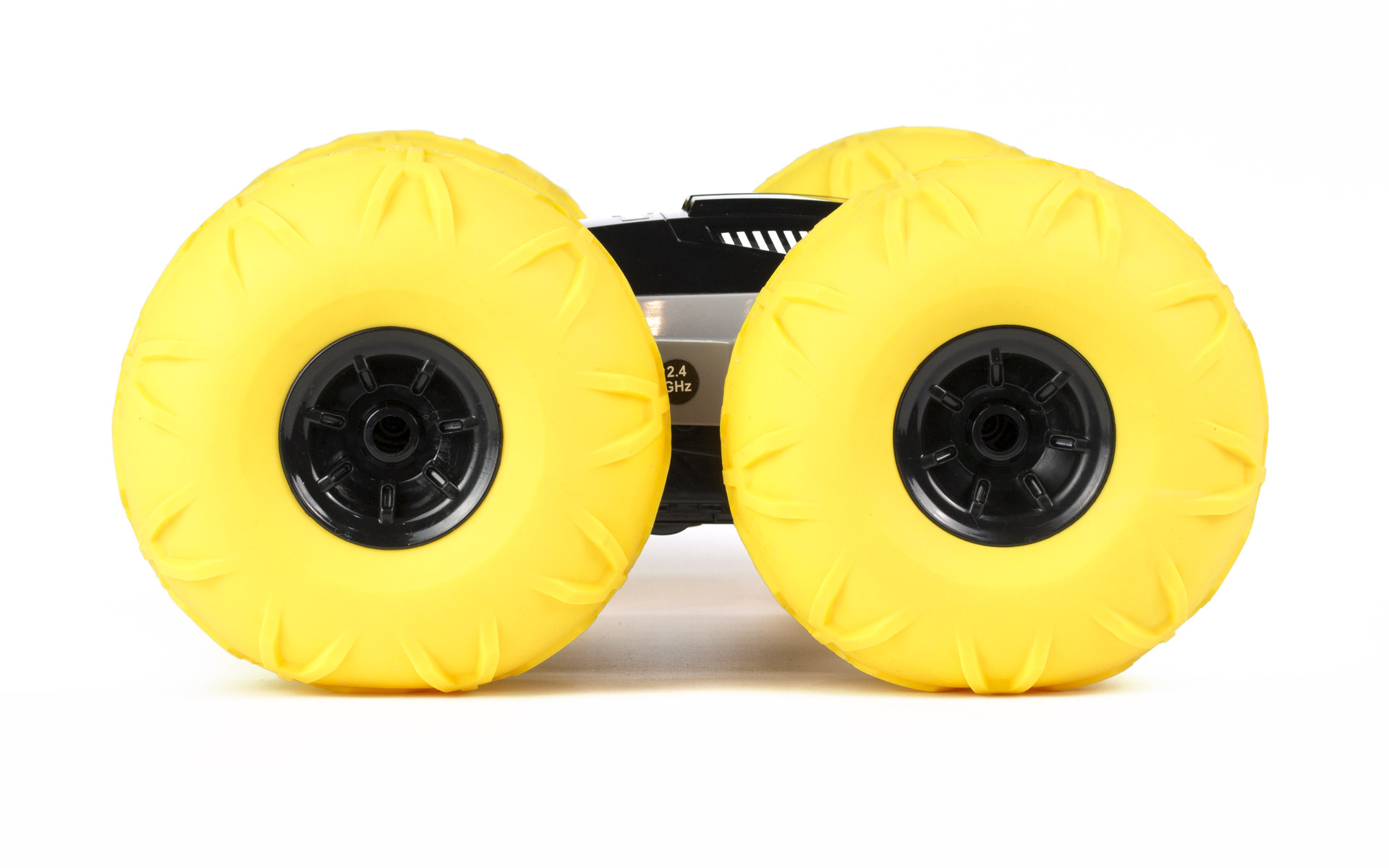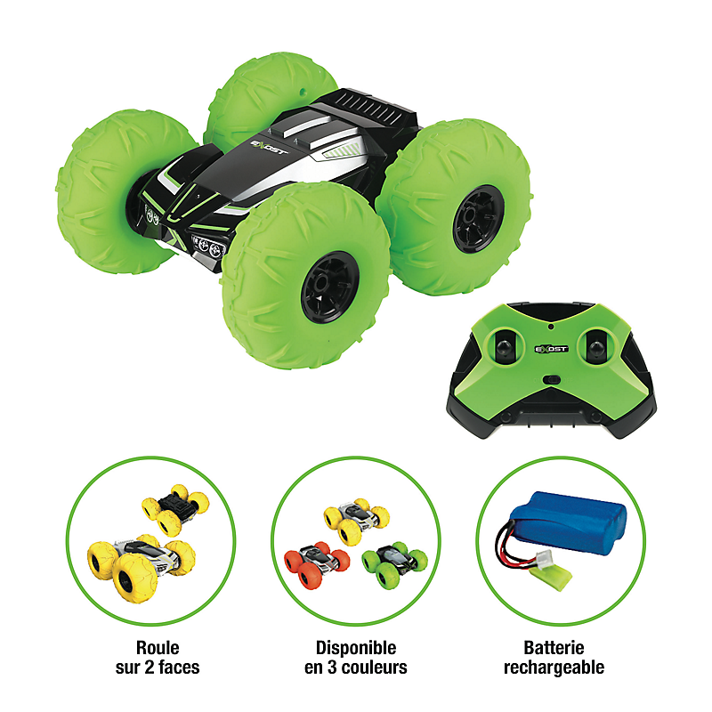 Défie tous les terrains à 360° avec la Tornado. Encore plus grosse que la 360 Cross, la 360 Tornado réalise des acrobaties impressionnantes pour un maximum de sensations ! Une accélération foudroyante, des pneus ultra résistants qui encaissent tous les chocs, rien ne résiste à cette voiture ! Dotée d'une technologie 2,4Ghz, défie jusqu'à 10 de tes amis en simultané, en extérieur ou en intérieur. Dispo en 3 couleurs: vert, jaune, rouge Vitesse réelle: 15km/h Vitesse à l'échelle: 150km/h. Piles : Batterie incluse (voiture) + 2xAA non incluses (émetteur). Pompe à air incluse pour gonfler les pneus et régler l'absorption des chocs. Dimensions : L25 x P23 x H12 cm Dès 5 ans.