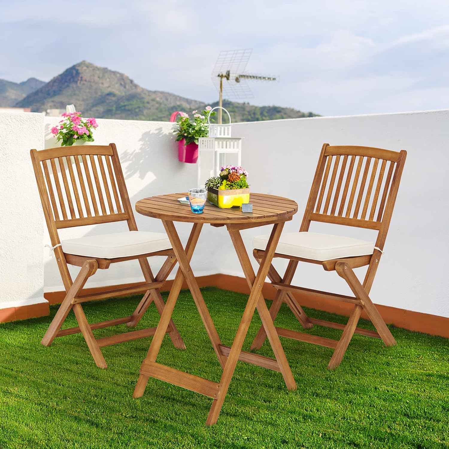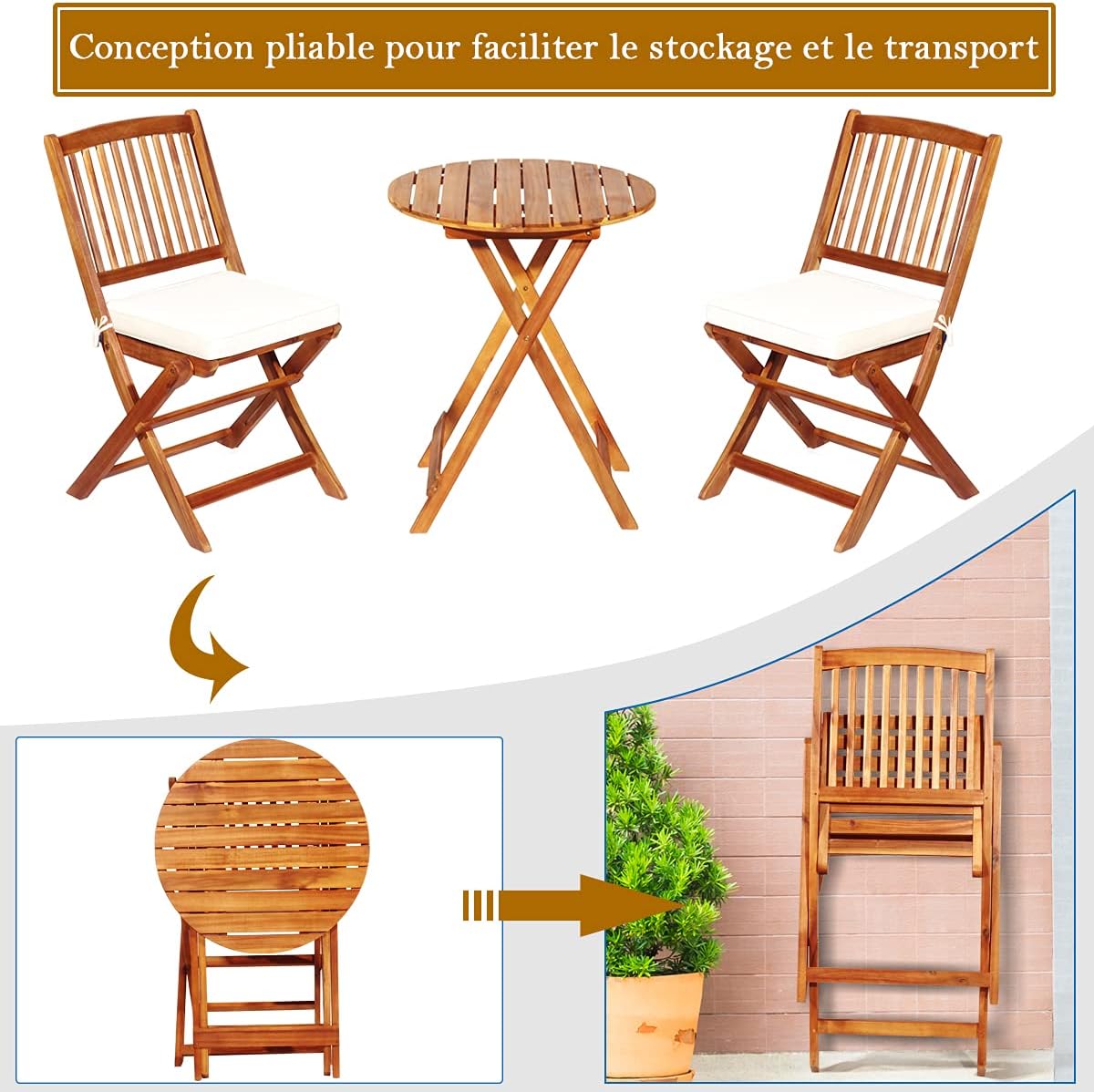 3pcs ensemble de bistro de jardin pliantes, 2 chaises et 1 table bois d'acacia, 2 coussins amovibles