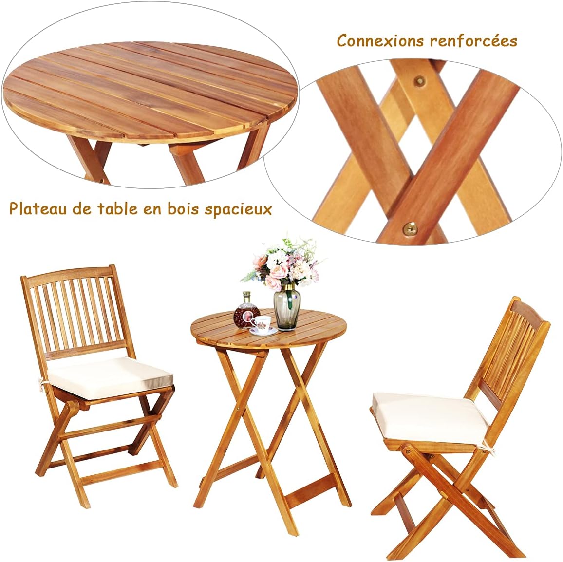 | Libellé | 3pcs ensemble de bistro de jardin pliantes, 2 chaises et 1 table bois d'acacia, 2 coussins amovibles |