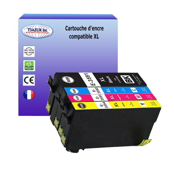 Remplacent les cartouches d'encre Epson T3591 / T3592 / T3593 / T3594 (35XL) - Compatible avec l'imprimante Epson WorkForce Pro WF-4720DWF, WF-4725DWF, WF-4730DTWF, WF-4735DTWF, WF-4740DTWF- Ce lot comprend: 1 Noire (45ml) + 1 Cyan (25ml) + 1 Magenta (25ml) + 1 Jaune (25ml) avec un rendement de 5% , repondent à toutes les normes européennes ISO 9001/14001, STMC, CE, ROHS - 100% Compatible - Encre de haute qualité qui garantie une excellence qualité d'impression - Marque T3AZUR