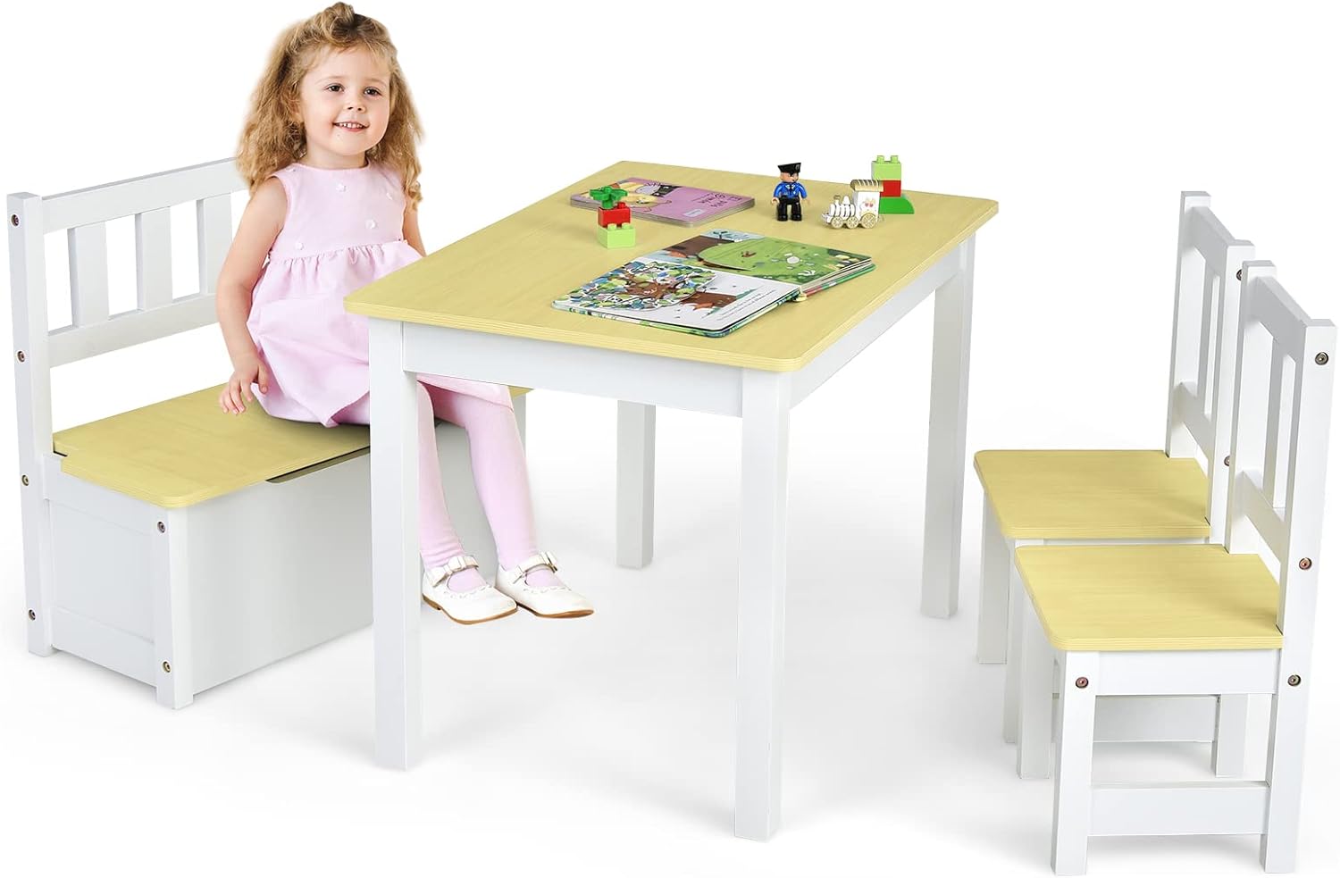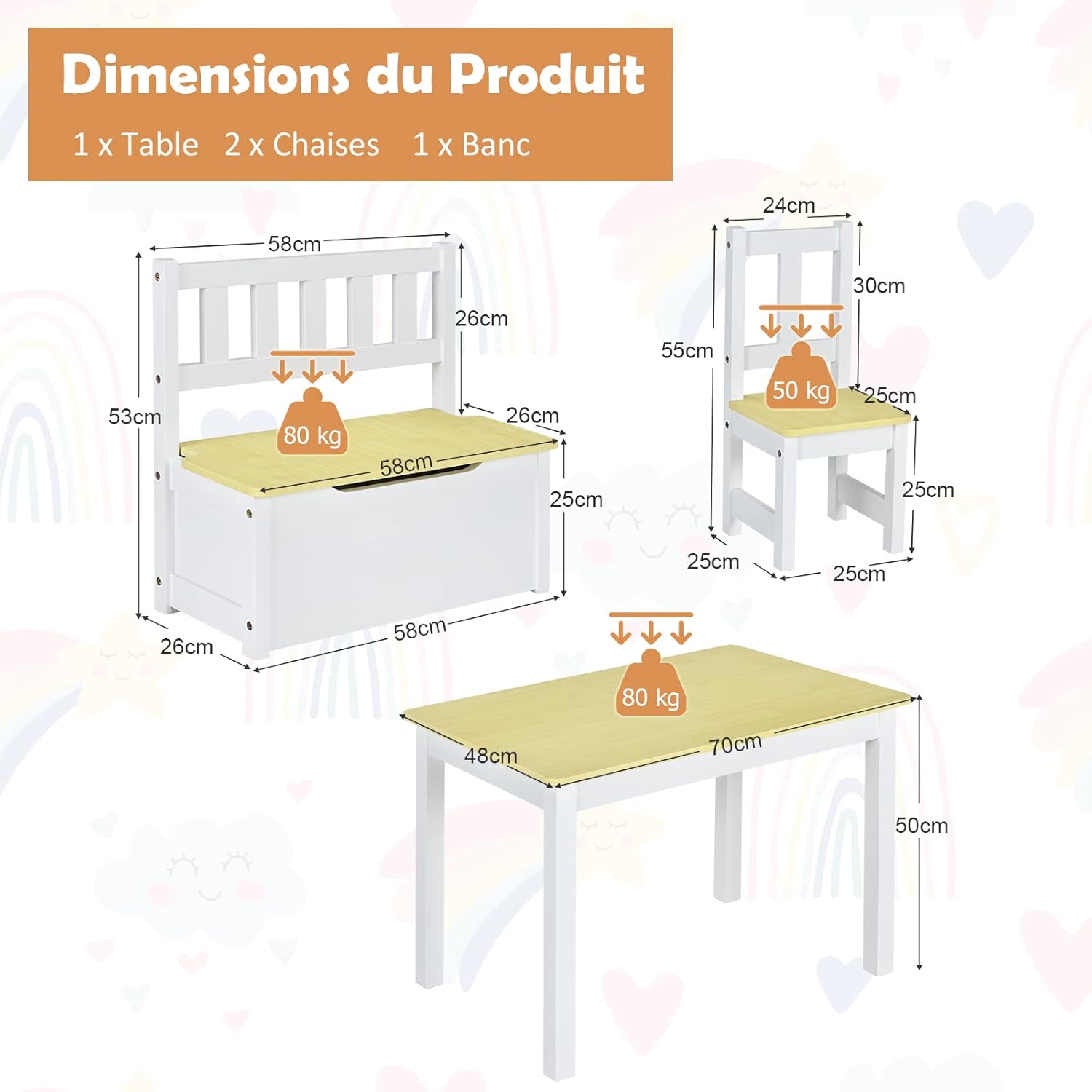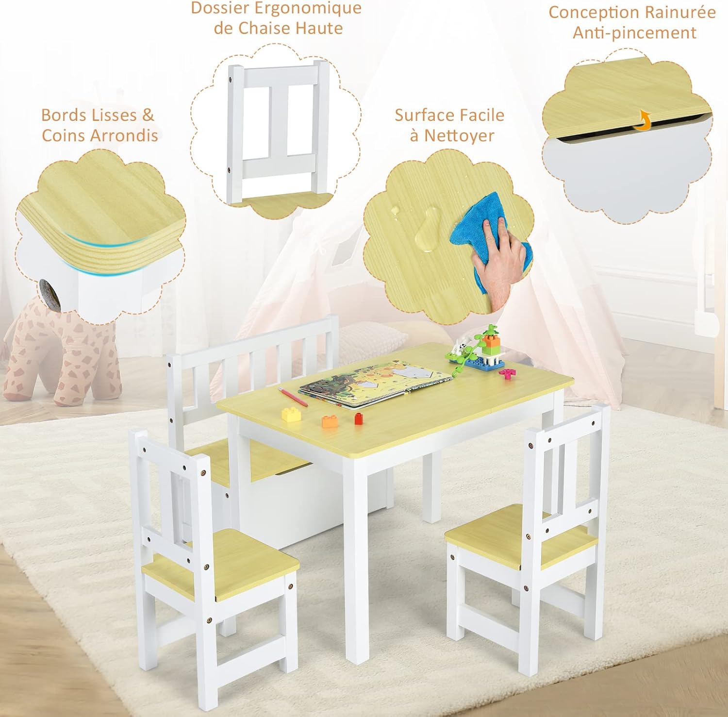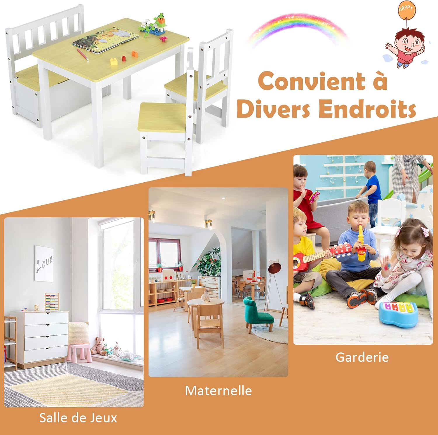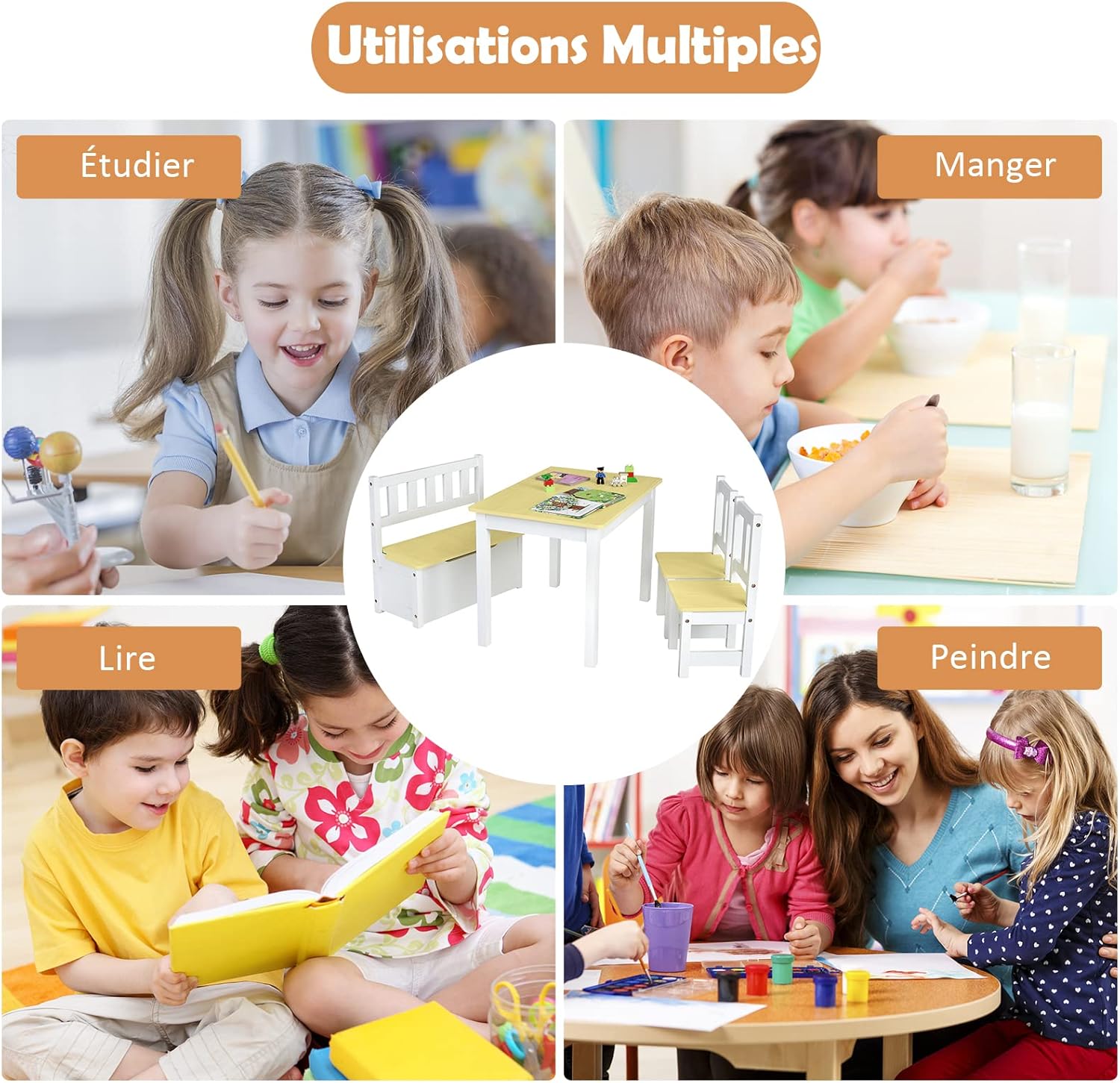| Libellé | 4 pcs ensemble de table et chaises pour enfant 2 en 1 ensemble de table activités pour tout-petits en bois avec 2 chaises 1 banc de rangement naturel |
