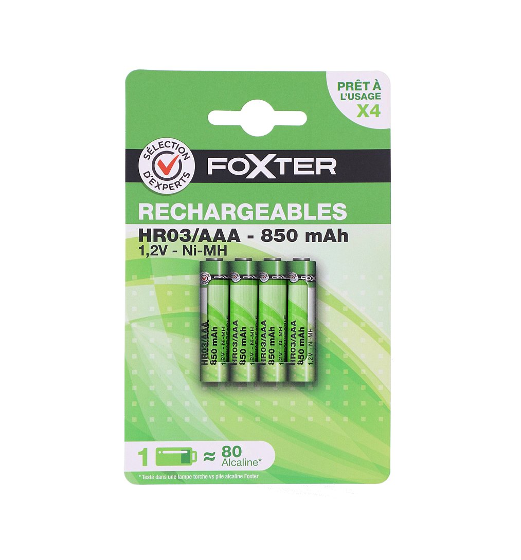 4 piles rechargeables HR03/AAA 850 mAh - Sélection d'Experts - Foxter - Type : rechargeable - Forme : HR03/AAA - 1,2V / Ni-MH - Prêtes à l'usage - 1 pile rechargeable = 80 alcalines* *testé dans une lampe torche VS pile alcaline Foxter