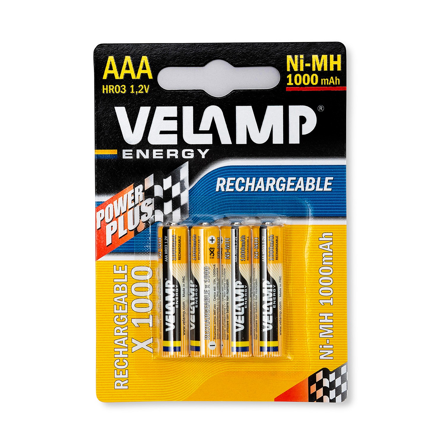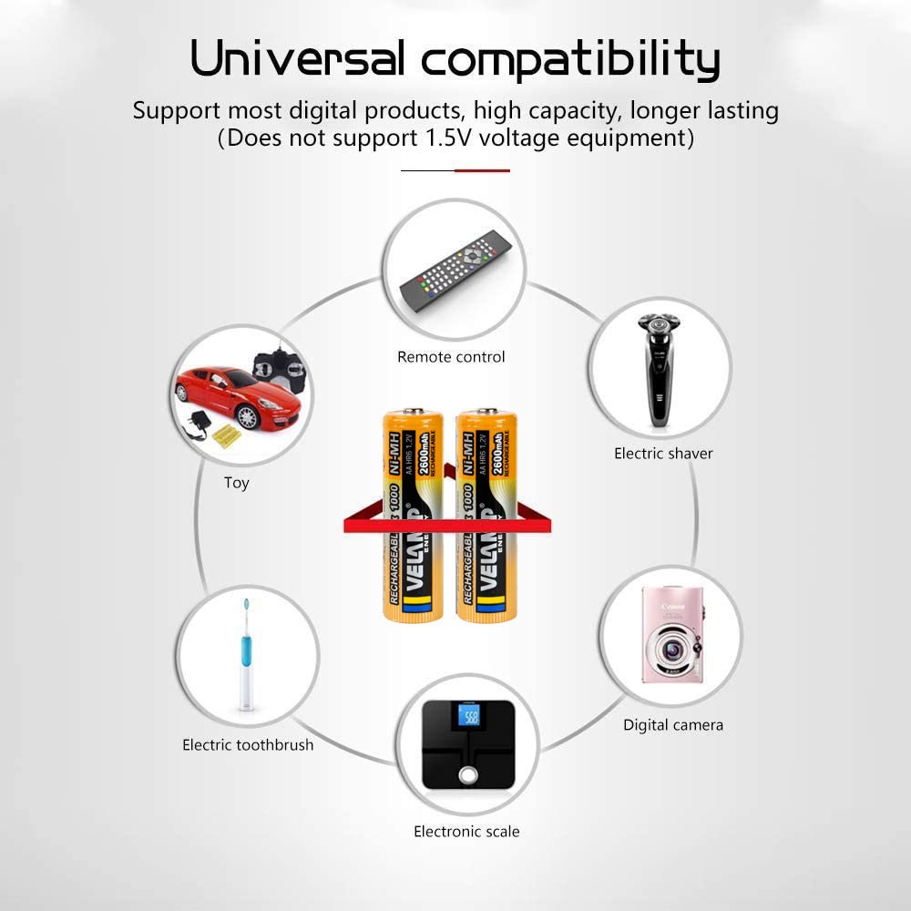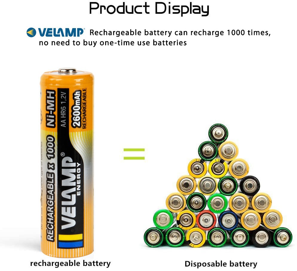 Batteries rechargeables Velamp: 4 batteries rechargeables AAA Ni-MH de 1000 mAh 1,2 V. Autodécharge réduite: les batteries rechargeables peuvent être rechargées plus de 1000 fois. Elles ont une faible autodécharge. Elles conservent toujours 80% de leur capacité après 3 ans de non utilisation (il est fortement recommandé de recharger complètement tous les 3 mois) . Compatible avec de nombreuses applications: les batteries rechargeables Velamp Ni-MH fonctionnent avec: appareils photo, souris pc, télécommandes, jouets jeux électroniques, portables, radio, lampes de poche, rasoirs électriques, réveil, téléphone sans fil, brosses à dents, rasoirs et plus. Sécurité: pour des raisons de sécurité, les batteries ne sont pas complètement chargées à l'arrivée, veuillez les charger à 100% la première fois que vous les utilisez. Après 3 à 5 fois de charge complète, les batteries fonctionnent mieux.