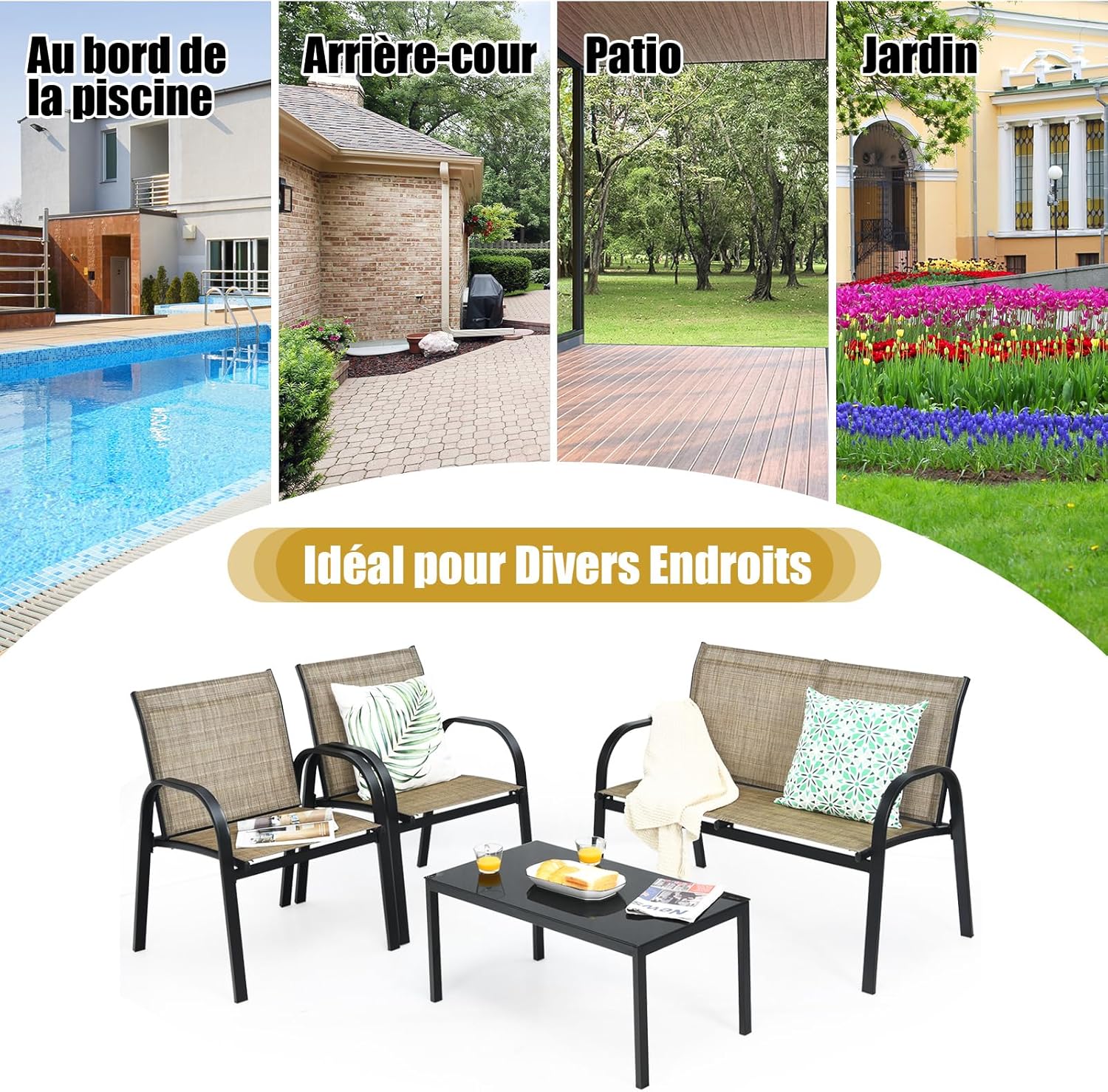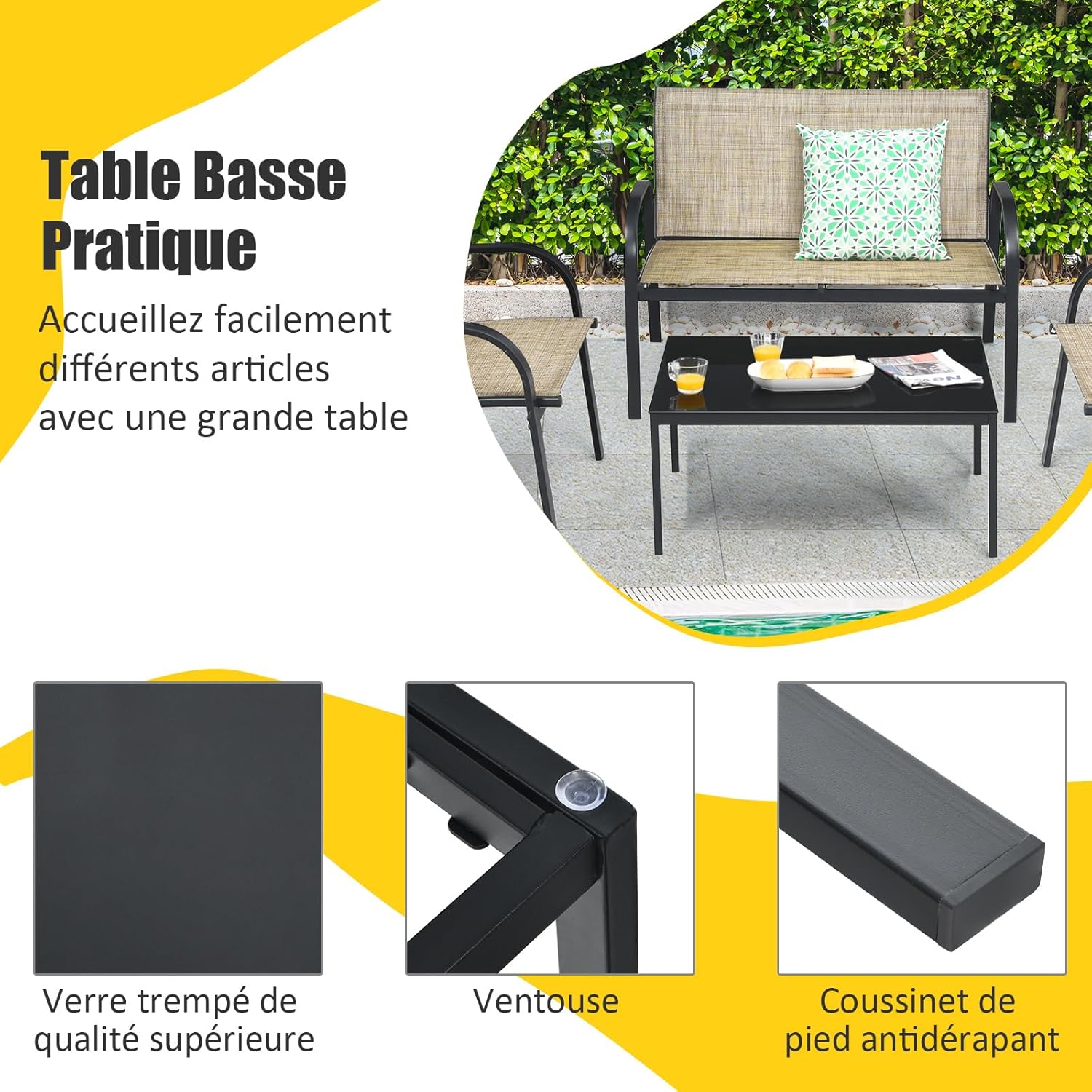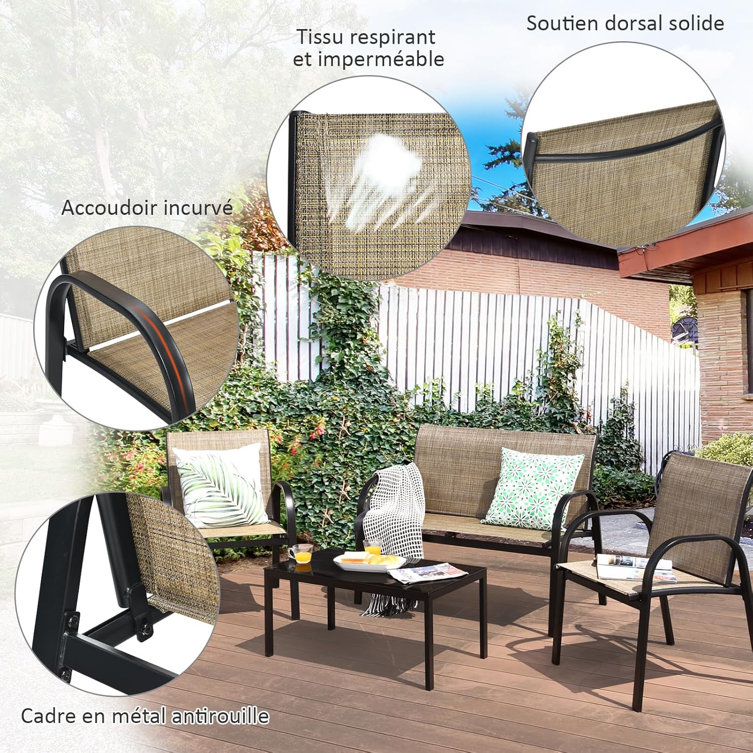4pcs ensemble de salon de jardin 4 personnes en tissu, table basse jardin avec 1 canapé+2 fauteuils sable
