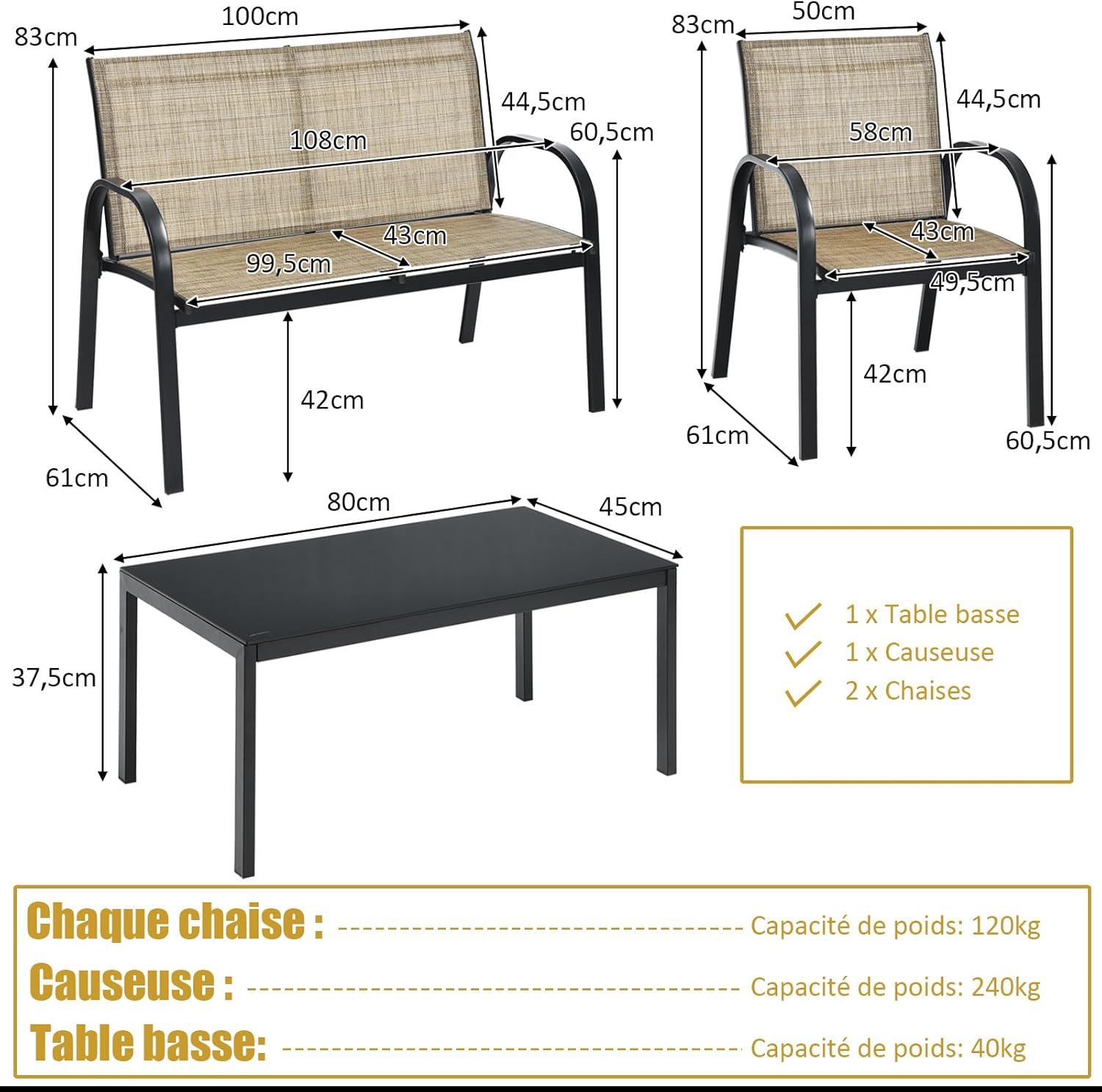 - Structure robuste et durable : Cet ensemble de 4 meubles, est fabriqué à partir de fer, chaque chaise est fixée avec des joints métalliques qui renforcent la stabilité de l'ensemble. La surface est enduite de poudre qui résiste aux rayures. La capacité de charge de la chaise simple supporte jusqu'à 130kg et la chaise double supporte jusqu'à 260 kg.