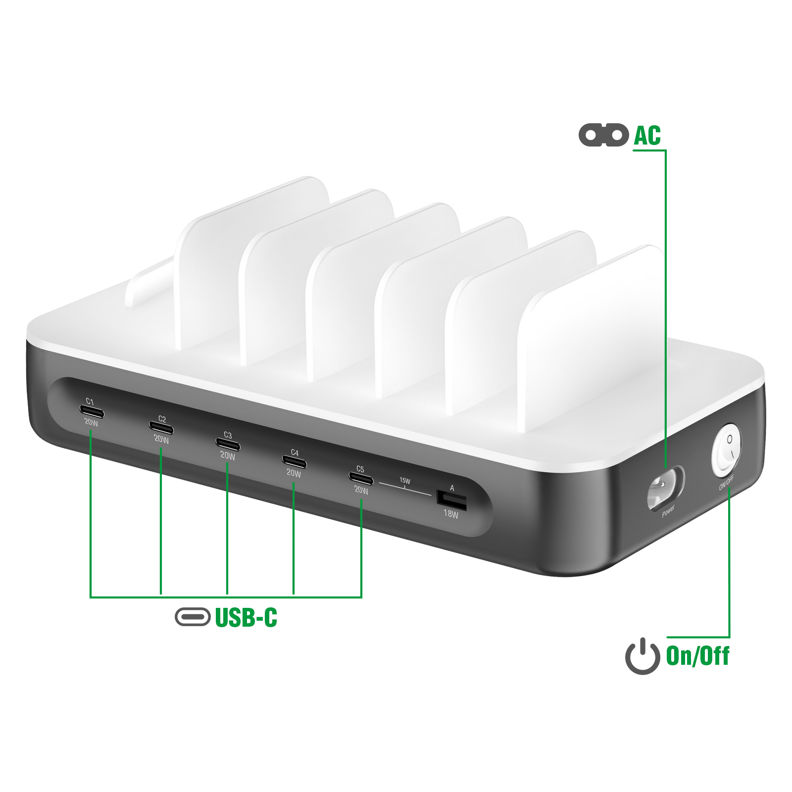 Station de charge multiport série Team de 4smarts. 5 ports USB-C (20W chacun) + 1 port USB. 100W de puissance totale. Inclut 5 câbles USB-C + 1 câble 4 en 2 (USB-C, Lightning, Micro-USB). Charge jusqu'à 9 appareils simultanément. Système de protection intégré. Bouton marche/arrêt. Séparateurs intégrés pour une organisation optimale. Design compact.