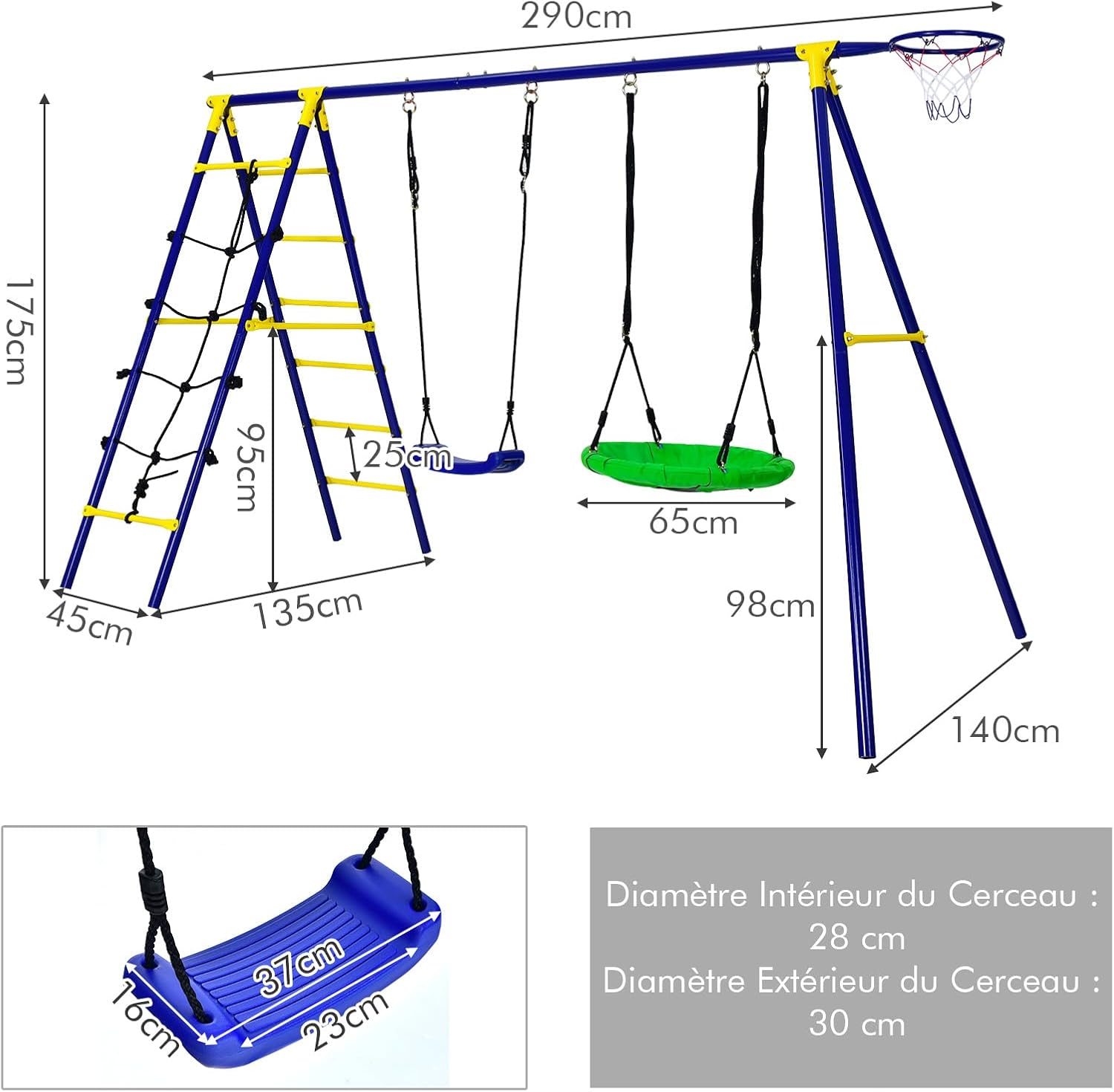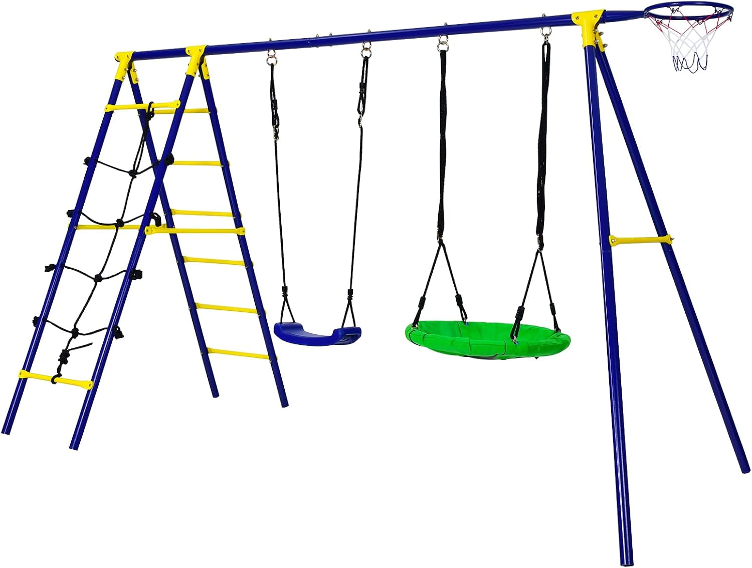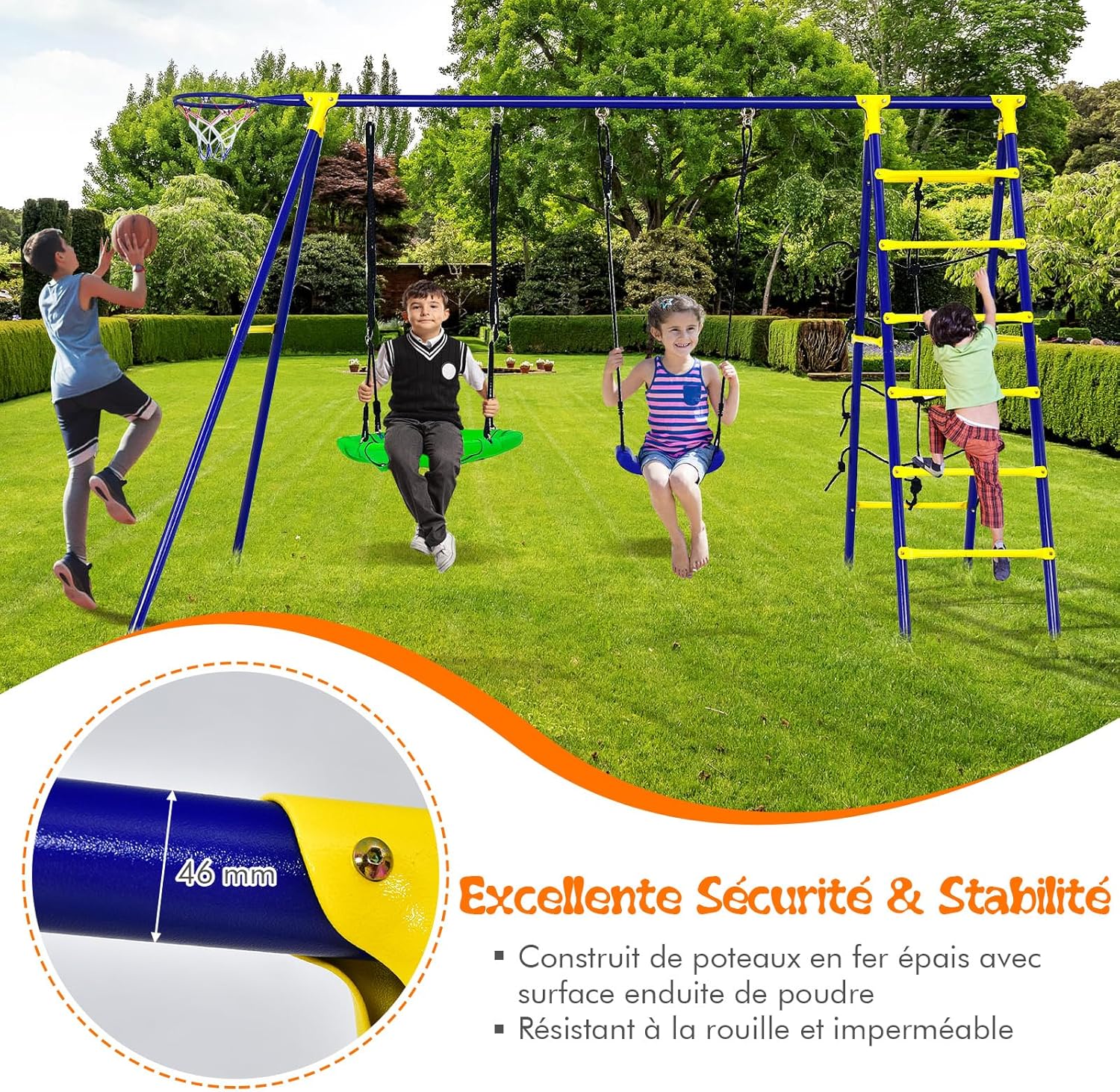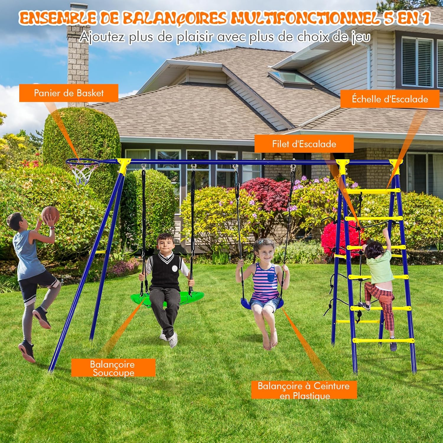 | Libellé | 5 en 1 balançoire extérieur avec portique et balançoire,hauteur réglable, avec filet d'escalade, échelle |