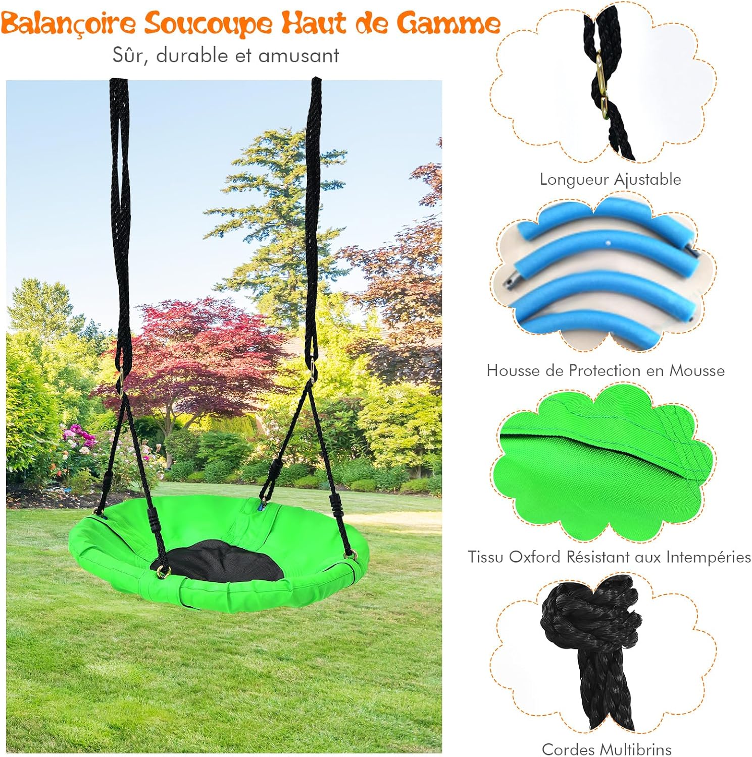 - Matériaux durables: La balançoire à disque est fabriquée en tissu Oxford résistant à l'abrasion et aux intempéries, tandis que l'autre balançoire (fabriquée en matériau PE résistant aux chocs, facile à nettoyer et durable) ne se déforme pas facilement.