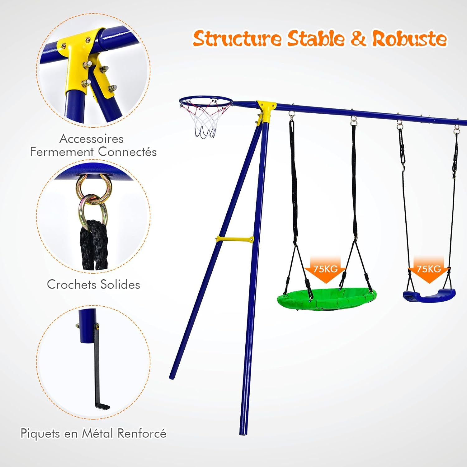 - Construction solide : Le cadre de la balançoire est soutenu par un métal épais et les tubes d'acier sont recouverts d'une peinture antirouille pour une meilleure durabilité, ce qui la rend parfaite pour une utilisation en extérieur. De plus, le cadre a une forme en A, parfaitement scientifique, qui garantit une grande stabilité.