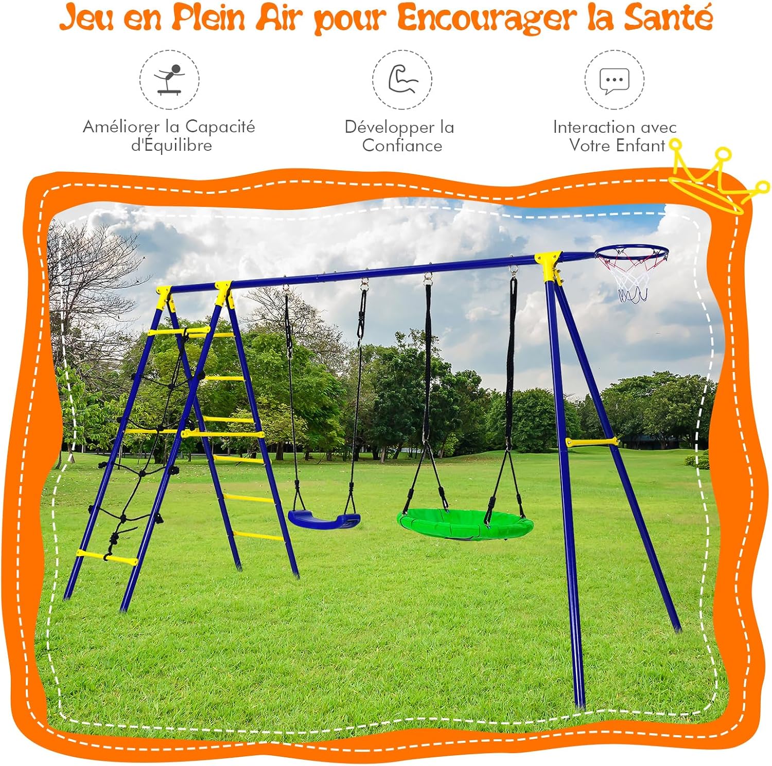 - Balançoire multifonctionnelle 5 en 1 : Cette balançoire comprend 2 sièges de balançoire, 1 panier de basket, 1 échelle d'escalade et 1 filet d'escalade pour une combinaison ultime de plaisir pour vos enfants. De plus, la hauteur des 2 balançoires peut être facilement ajustée pour répondre aux différents besoins de vos enfants.