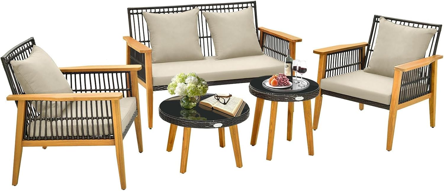 5 pièces salon de jardin en rotin, ensemble de meubles de jardin avec cadre en bois d'acacia