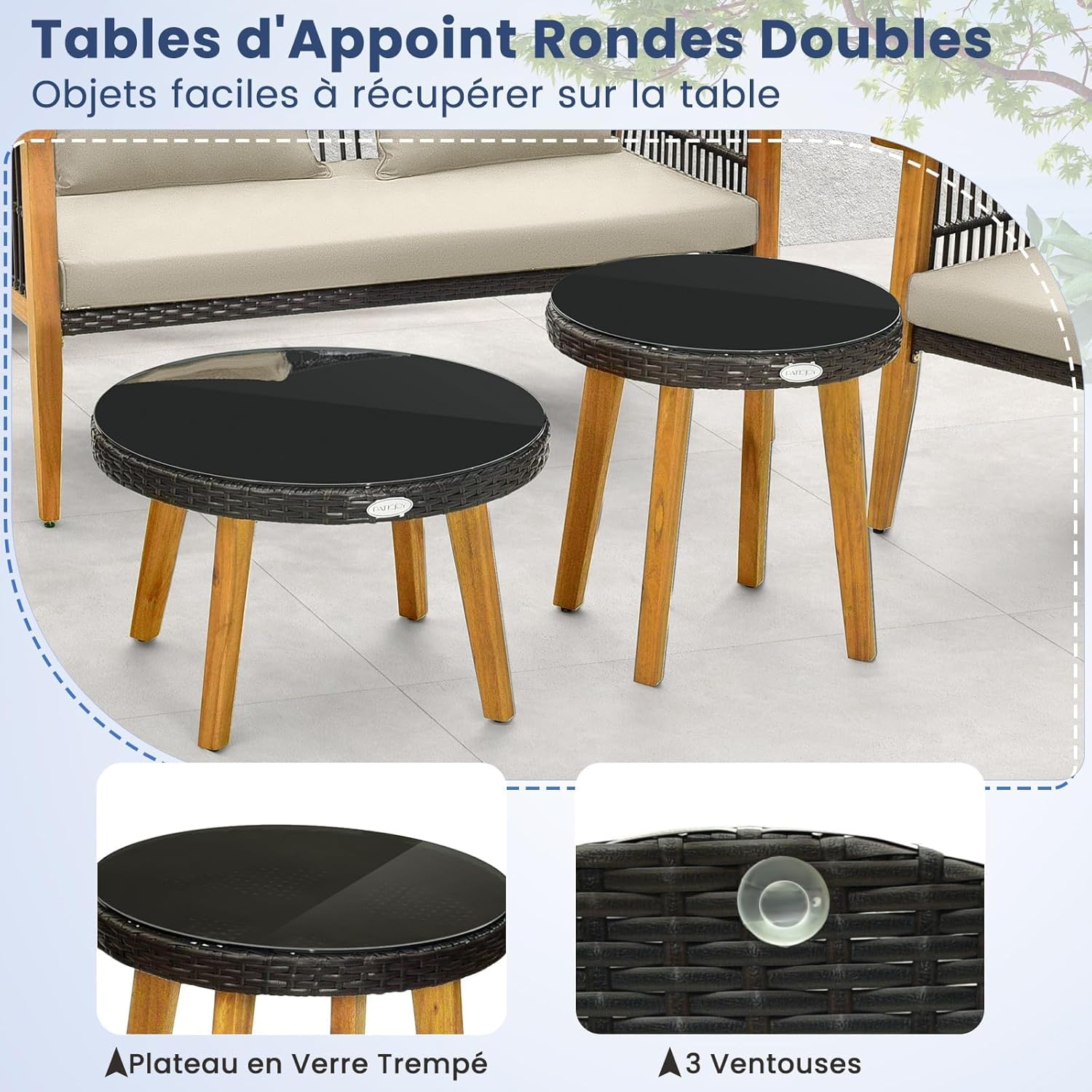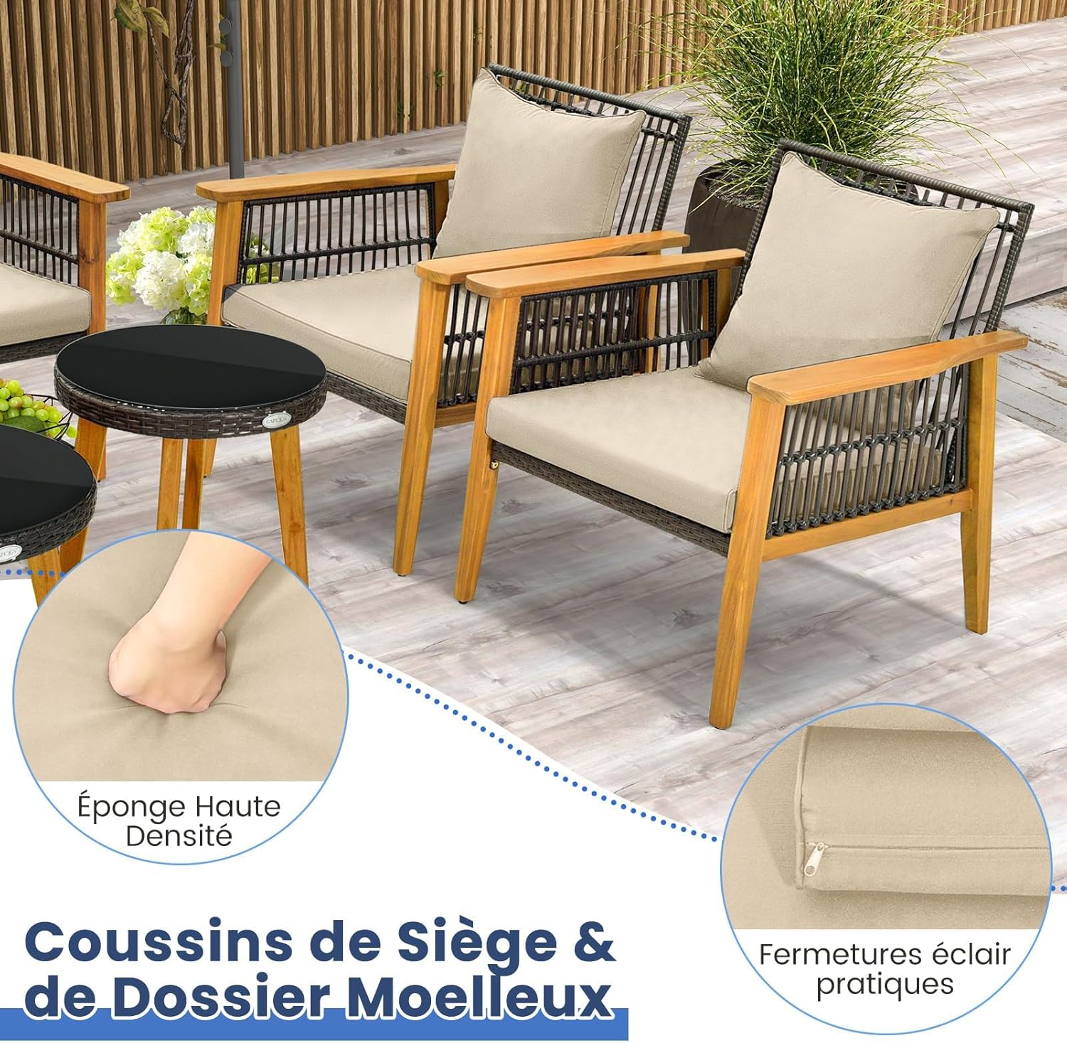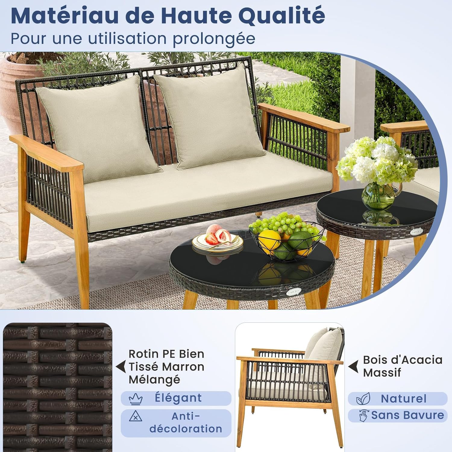 Matériau : Rotin PE, Métal, Bois d'Acacia, Polyester, Éponge, Verre trempé