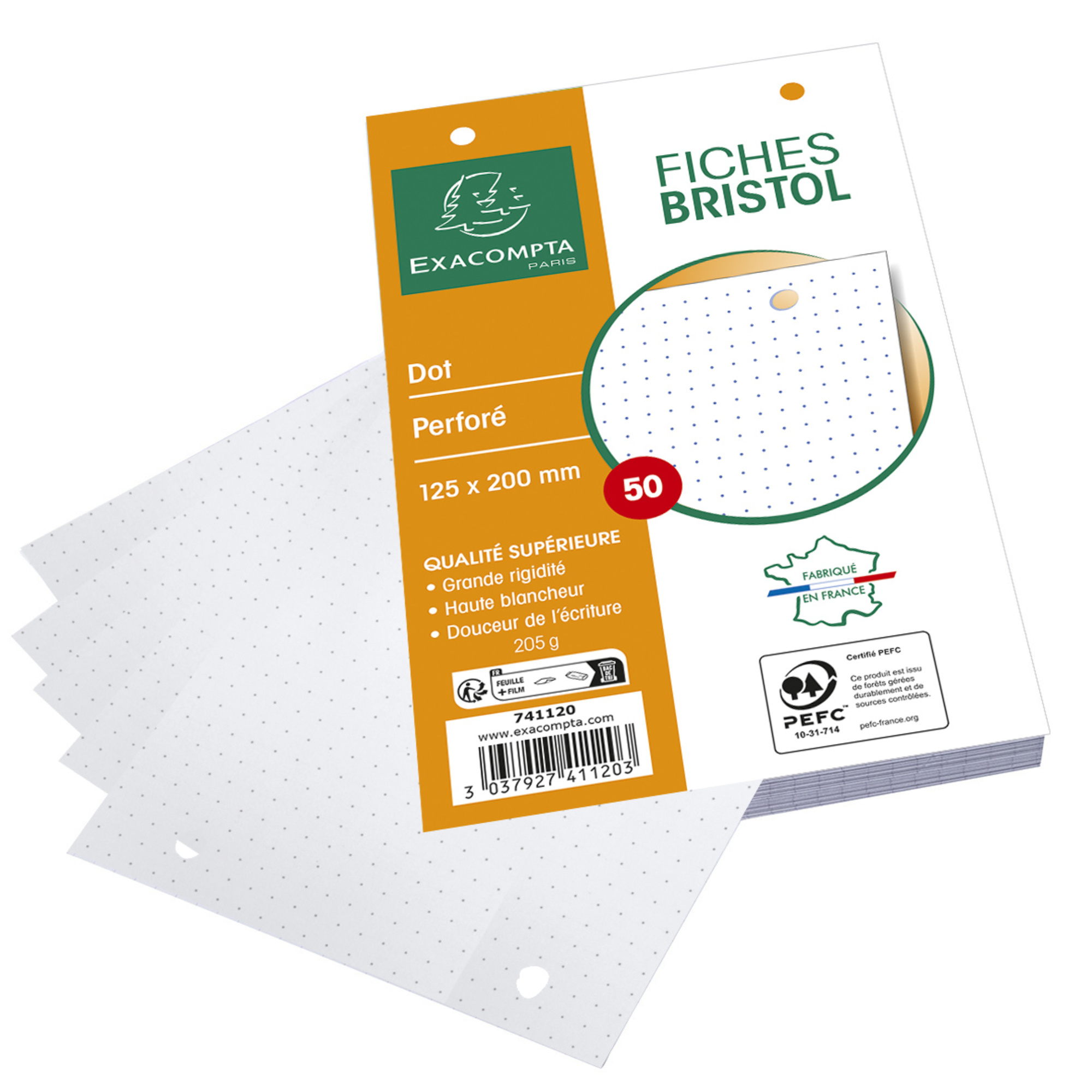 | Libellé | 50 Fiches Bristol Blanches Perforées 125X200 Dot P.E.F.C. 205G Sous Film Avec Encart Exacompta |