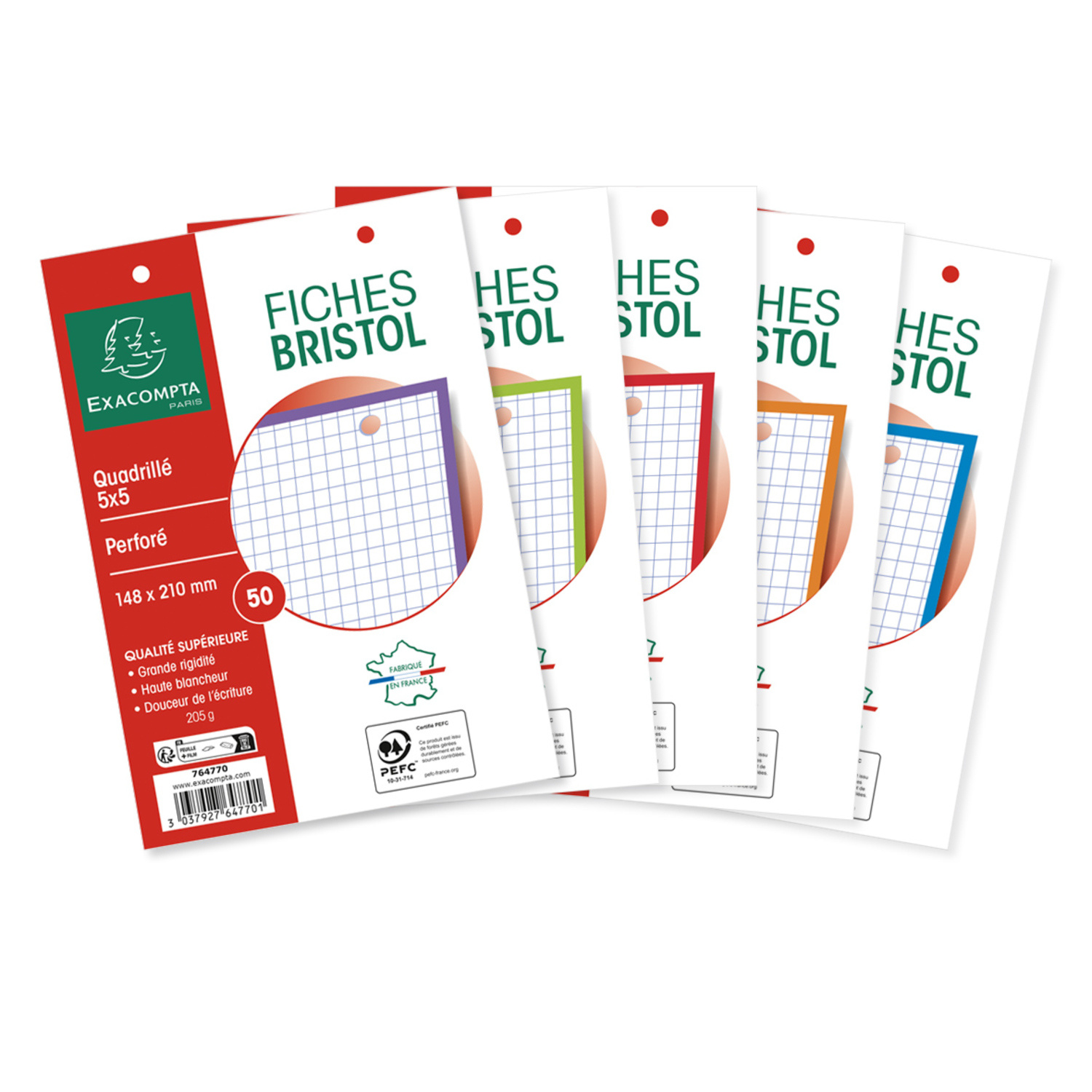 Libellé 50 Fiches Bristol Perforées 148X210 5X5 P.E.F.C. 205G Bristol Bords De Couleur 5 Couleurs Exacompta