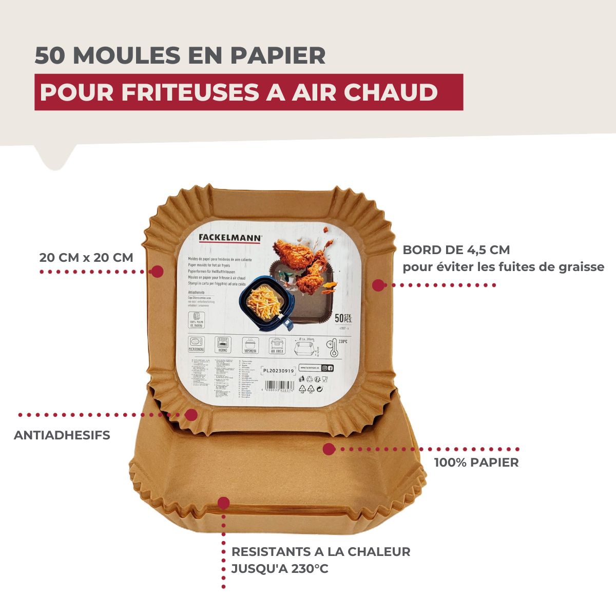 DESCRIPTION : Fackelmann vous présente ce lot de 50 moules en papier pour air fryer carrés, un accessoire indispensable pour vos friteuses à air chaud ; ces moules air fryer très pratiques sont antiadhésifs, et résistants à la chaleur jusqu'à 230° PETIT + : Ce moule pour friteuse air fryer facilite le nettoyage ; en empêchant les aliments et les graisses de coller aux paniers, il prolonge la durée de vie de votre friteuse sans huile COMPOSITION : Notre moule air fryer est composé de papier de haute qualité, sans BPA, non toxique, non blanchi ; il est revêtu de silicone antiadhésif sur les 2 faces ; compatible cuisson micro-ondes, fours traditionnels, cuiseurs vapeur et poêles DIMENSIONS : Ces moules pour friteuse à air chaud mesurent 20 cm x 20 cm et 4,5cm de haut ; ils sont compatibles avec les plus grandes marques de friteuses sans huile telles que Moulinex, Ninja et Philips ; pensez à vérifier taille de votre modèle UTILISATION : Ces moules en papier pour friteuse air fryer sont faciles à utiliser vous permettent de cuire et de frire avec très peu d’huile de nombreux aliments comme les frites, légumes, viandes, poissons, samoussas, falafels, beignets, gâteaux Nos moules en papier pour air fryer sont 100% en papier de haute qualité, sans BPA, non blanchi. Avec leur revêtement silicone sur les 2 faces, ils sont antiadhésifs, et résistants à la chaleur jusqu'à 230°. Conçus pour les friteuses sans huile, ils peuvent également être utilisés dans le micro-ondes, le four traditionnel et le cuiseur vapeur. Ils sont compatibles avec les plus grandes marques de friteuses sans huile telles que Moulinex, Ninja et Philips : vérifiez les dimensions de votre modèle. Ils vous permettent de cuire et de frire avec très peu d’huile de nombreux aliments comme les frites, légumes, viandes, poissons, samoussas, falafels, nems, tempura, beignets, gâteaux !