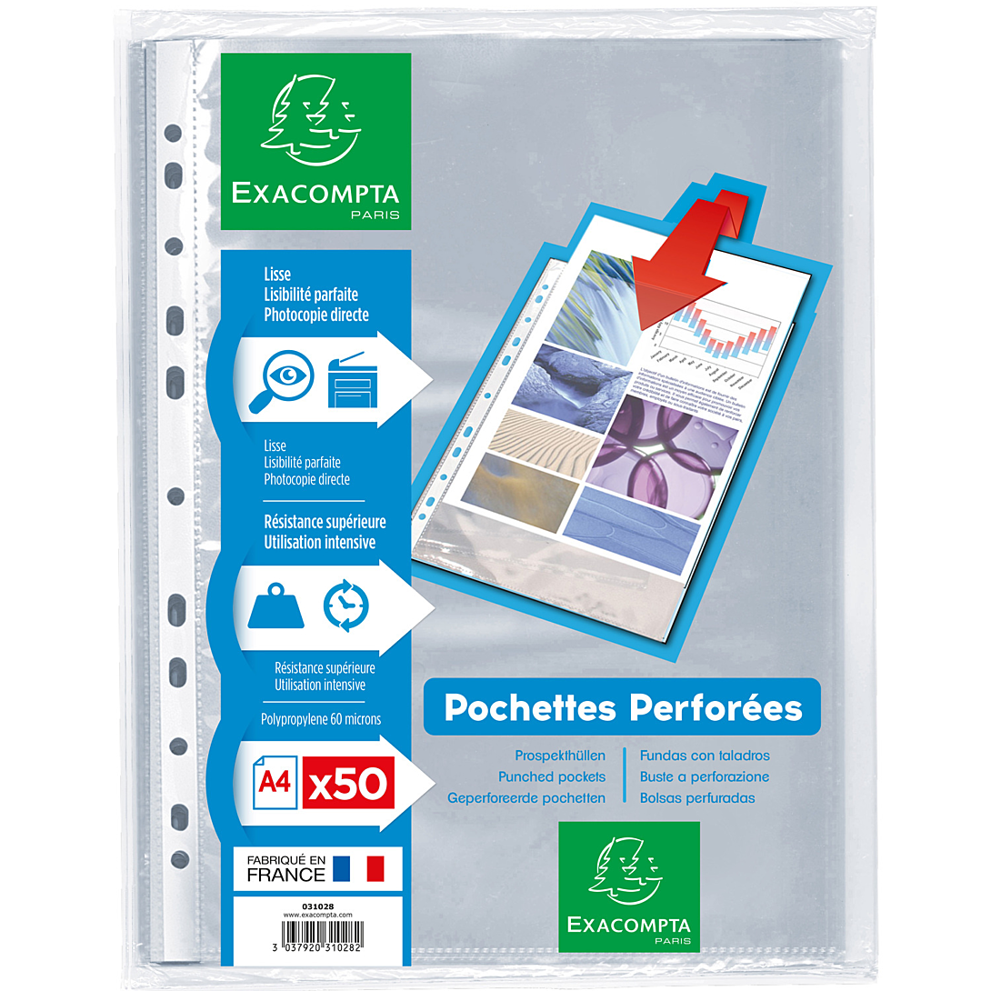 Pochettes lisses Exacompta pour une très grande transparence. * En polypropylène épaisseur 6/100ème pour un usage quotidien et durable *Le format des pochettes permet l'insertion de documents A4 correctement et facilement *Elles disposent de 11 perforations avec bande de renfort pour résister aux manipulations et convenir à tout classeur *Paquet de 50 pochettes *Ouverture par le haut