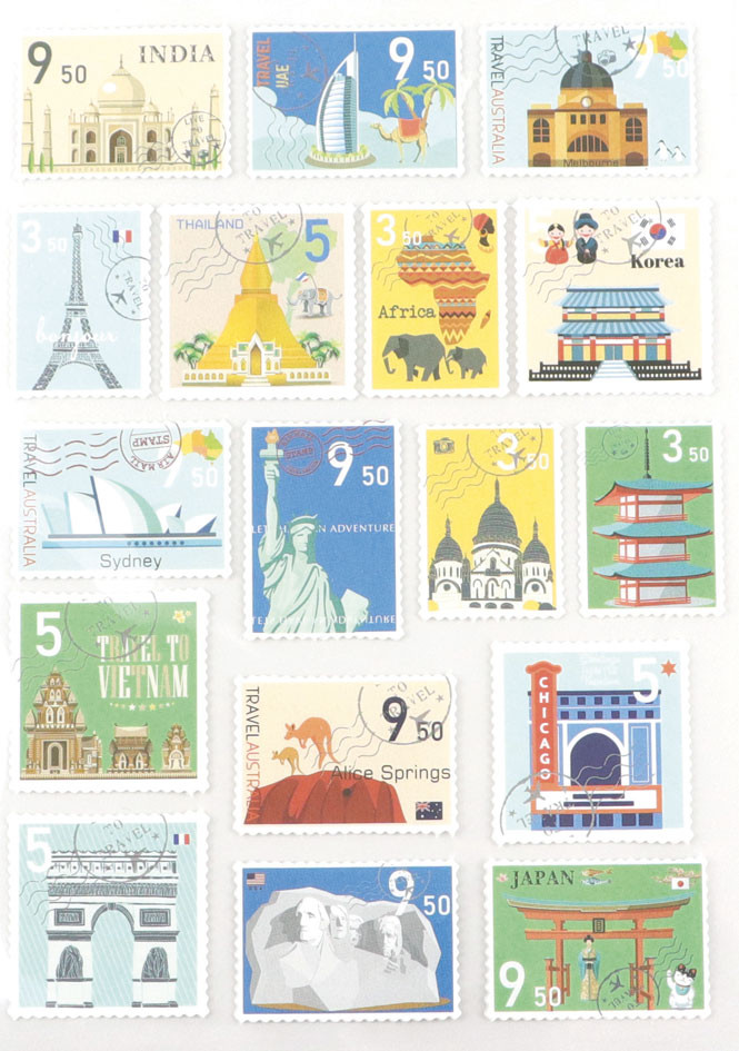 Cette planche de stickers en forme de timbre sera parfaite pour vos projets de scrapbooking, vos cartes de vœux, vos faire-part et toutes vos idées de DIY. Dimensions des stickers : 3 cm. Vous allez pouvoir réaliser de magnifiques albums de voyages et personnaliser vos photos ou vos petits mémos souvenirs. Plusieurs pays sont mis à l'honneur : la France, l'Australie, l'Inde, l'Afrique, le Vietnam, le Japon, le Mexique ou les Etats-Unis. Attention : ces timbres ne sont pas utilisables pour expédier votre courrier.