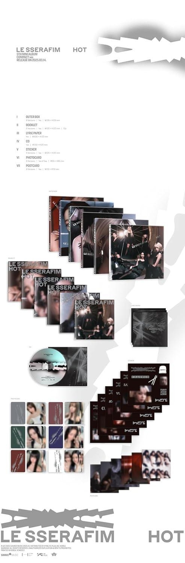 Pour conclure le chapitre de la trilogie EASY et CRAZY, LE SSERAFIM est de retour avec le 5ème mini album HOT ! Disponible en version COMPACT, 1 visuel par membre et 1 de groupe. Chaque album comprend : un CD, une boîte, un photobook (12 pages), un feuillet de paroles, un sticker, 1 photocard (aléatoire sur 3) et une carte postale. Dimensions : 128 x 128 x 8 mm.