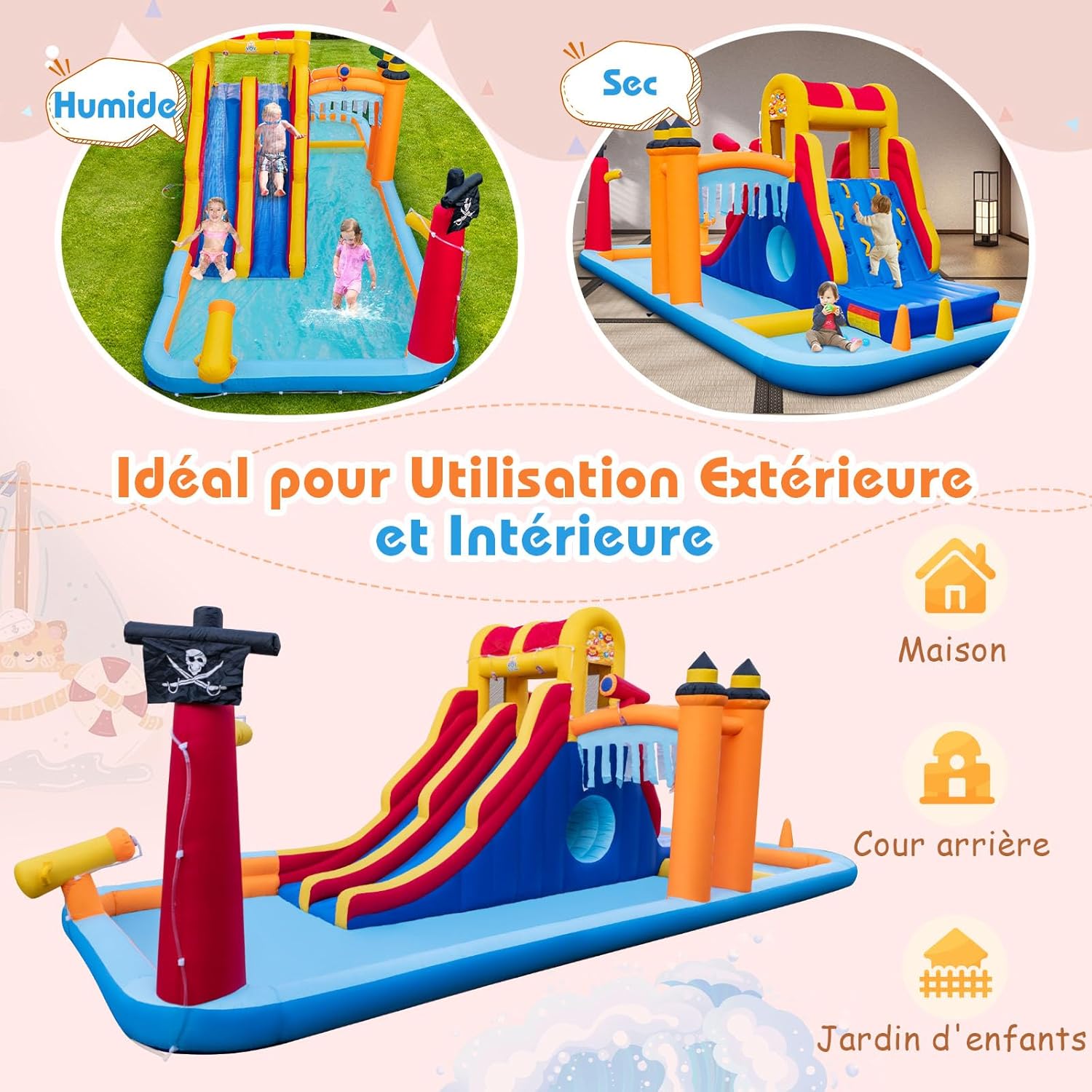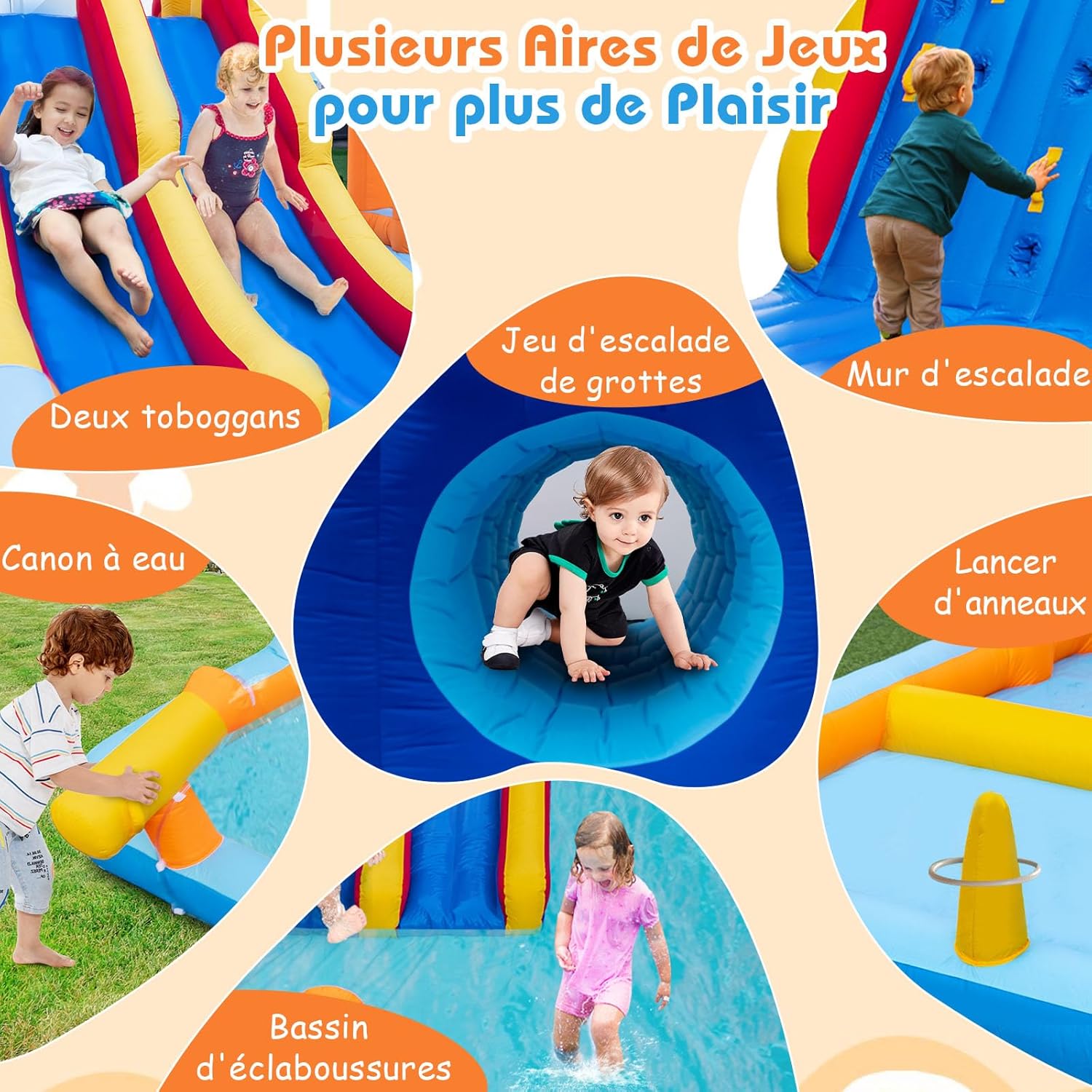 - Plusieurs zones de jeu pour plus de plaisir : Conçu avec plusieurs zones de jeu, telles qu’un double toboggan, un mur d'escalade, un canon à eau, des pataugeoires, un lancer d'anneaux et un jeu d'exploration de grottes, ce château gonflable offre diverses options de divertissement pour que les enfants puissent profiter d'un moment heureux et inoubliable.