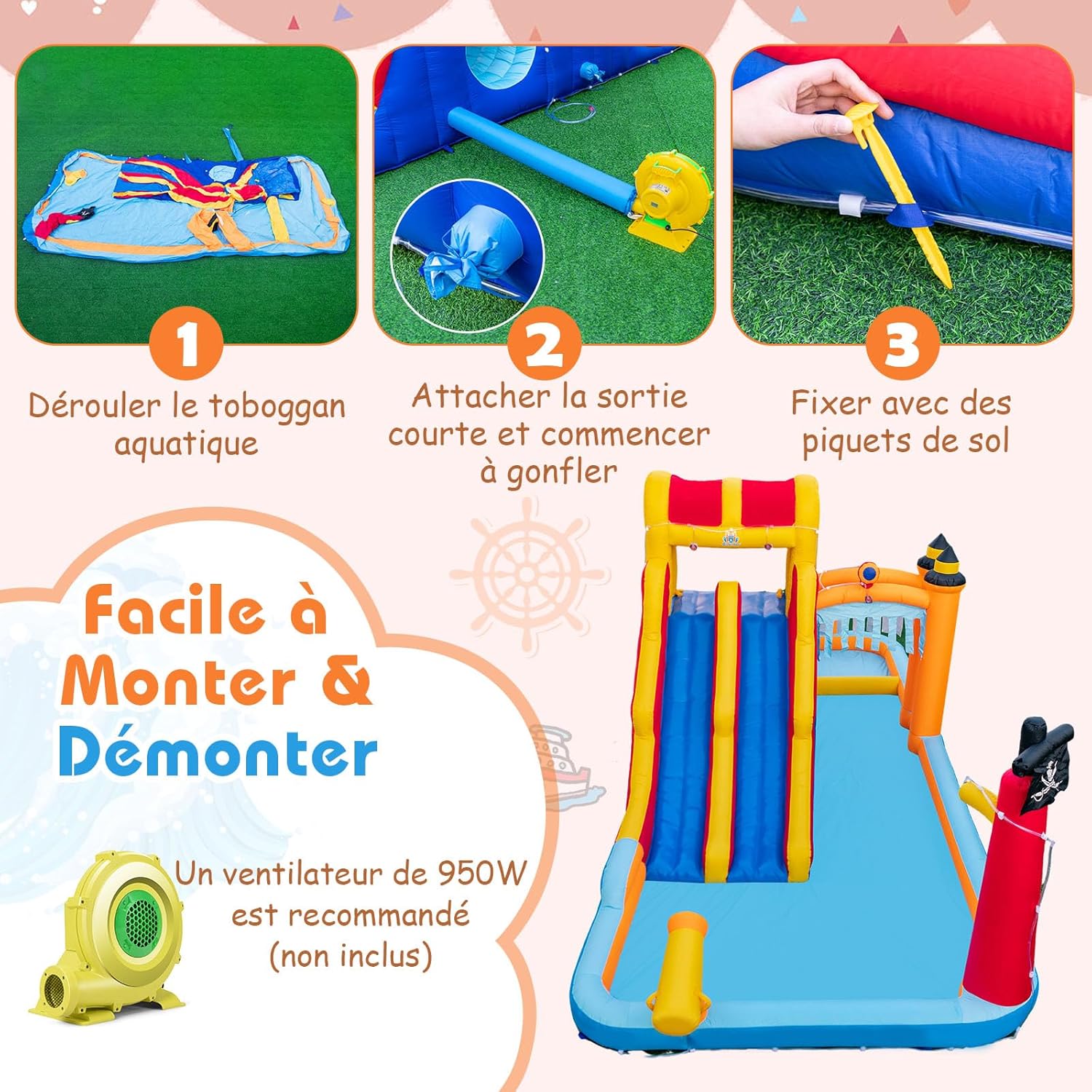 | Libellé | 6 en 1 château gonflable enfants, 2 toboggans, mur d'escalade, canon à eau, pataugeoires, grottes, piquets, sac de transport, charge 90kg |