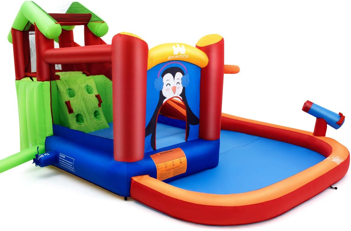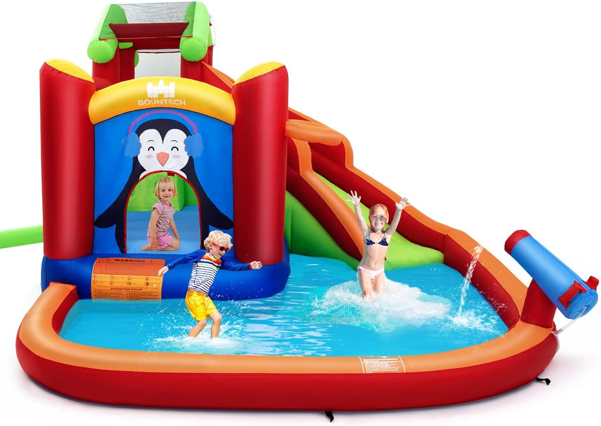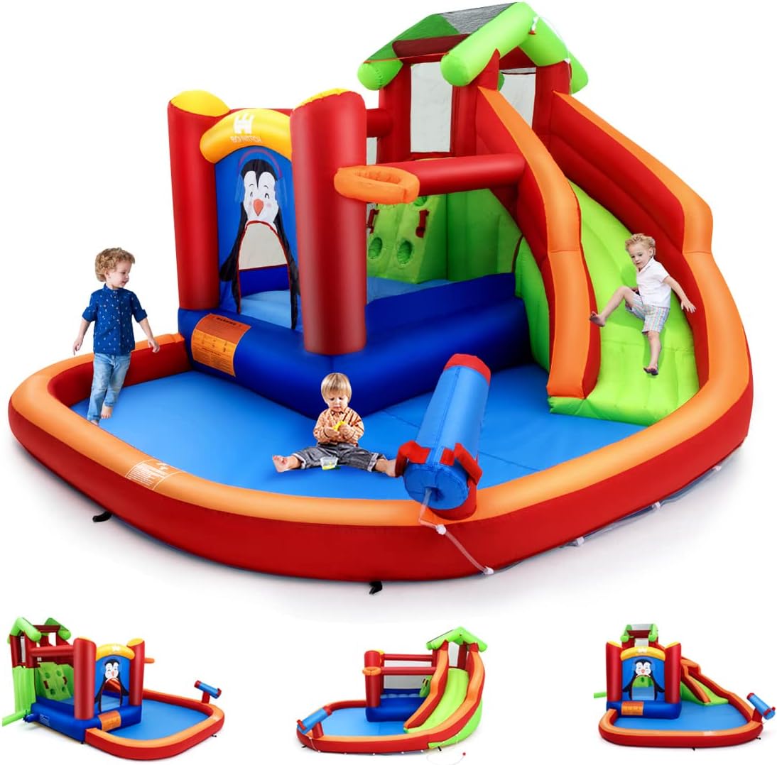 6 en 1 château gonflable pour 3 enfants 3-10 ans pingouins, parc aquatique gonflable avec toboggan,trampo