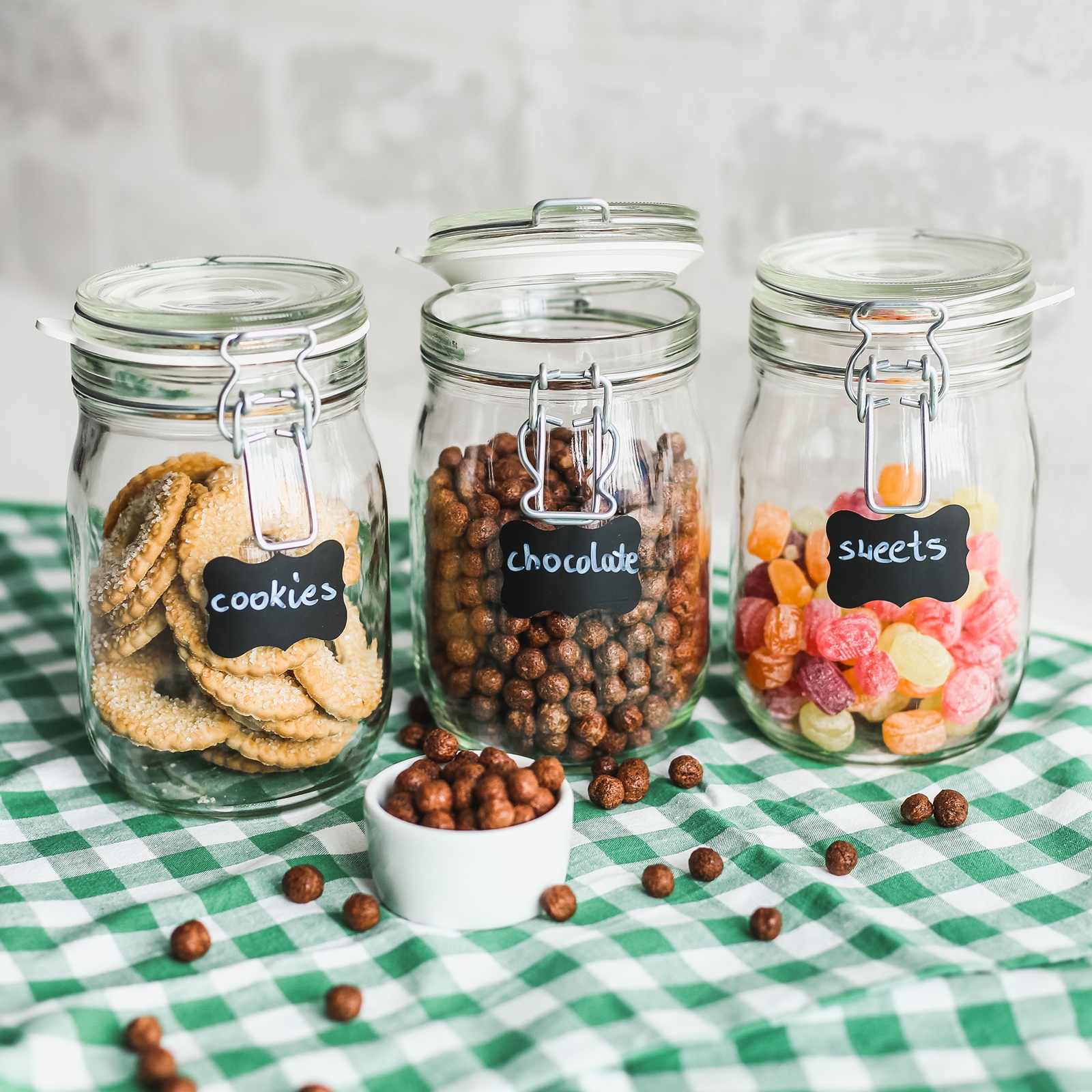 ENSEMBLE PARFAIT – Notre set de 6 bocaux de 1000 ml est idéal grâce au grand joint hermétique en silicone assure qu'aucun air n'entre ou ne sort du pot, préservant ainsi la fraîcheur, la saveur et l'arôme des aliments qui sont conservés dans les bocaux. Le set contient les autocollants réutilisables et la craie pour étiqueter les aliments stockés, donc le produit crée un accessoire attrayant pour la cuisine et la maison. MULTIPLES UTILISATIONS - Les bocaux sont parfaits pour stocker biscuits, sucre, céréales, cannelle, herbes, épices, cornichons, miel, graines, thé, café, chocolat, spaghetti, graines de café, thé, confiture, pâtes, produits de boulangerie ou friandises pour chiens. Ils peuvent être utilisés pour stocker des articles non alimentaires tels que des pièces de monnaie,des petits objets, des bobines, des jouets et des accessoires. DÉCORATION DE CUISINE – Ces bocaux sont non seulement utiles, mais aussi jolis dans votre cuisine grâce au design unique. Vous ne devez plus cacher vos produits dans les placards – vous pouvez afficher votre nourriture car le verre transparent vous permet de voir le contenant du pot pour un accès rapide et facile. CONCEPTION PRATIQUE - Un verre certifié européen solide combiné à un levier en métal bien construit et bien ajusté génère une expérience sans frustration lors de l'ouverture et de la fermeture du pot qui empêche l'usure à long terme et la formation de déchirures, prolongeant ainsi la durée d'utilisation des pots.