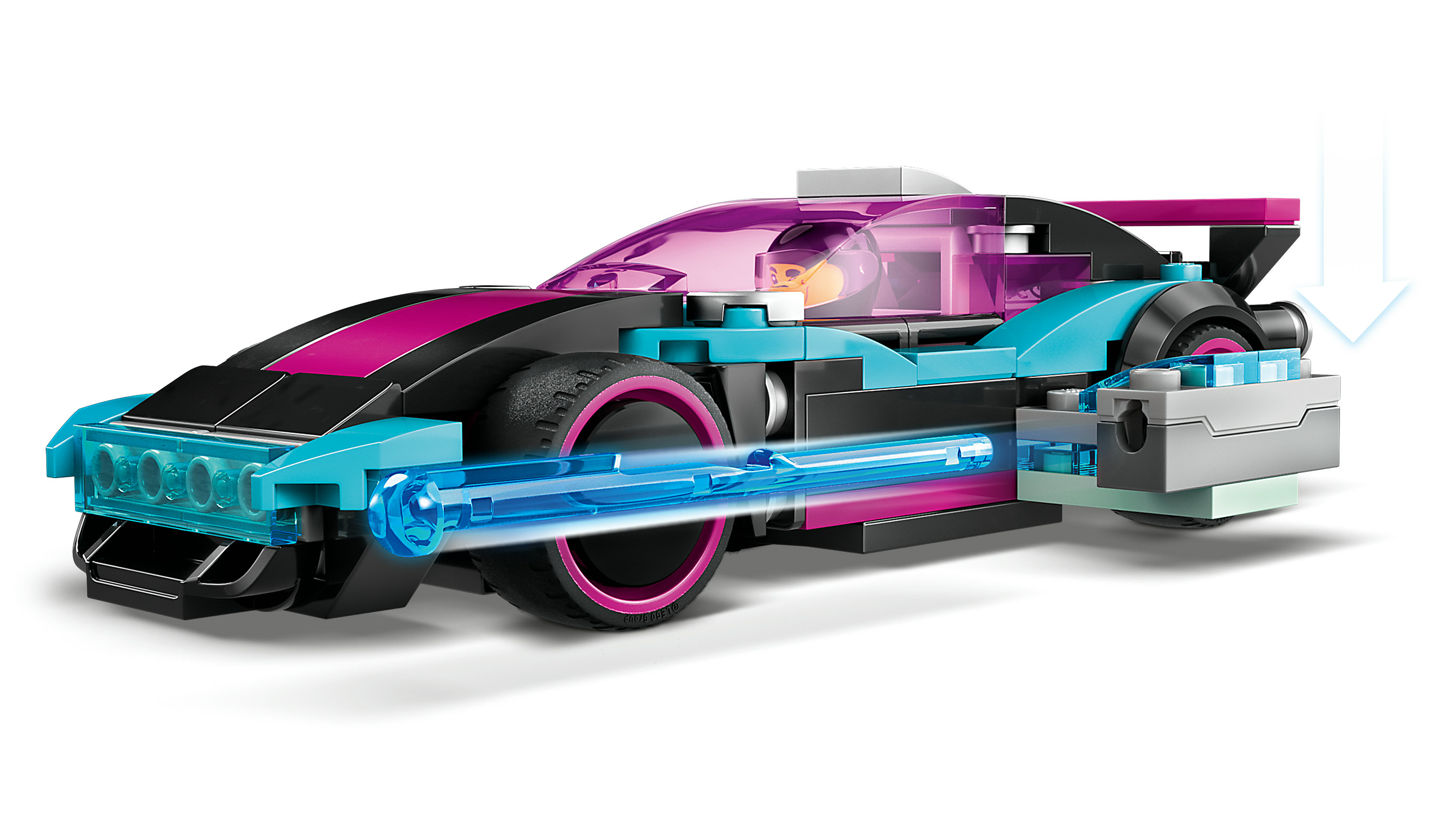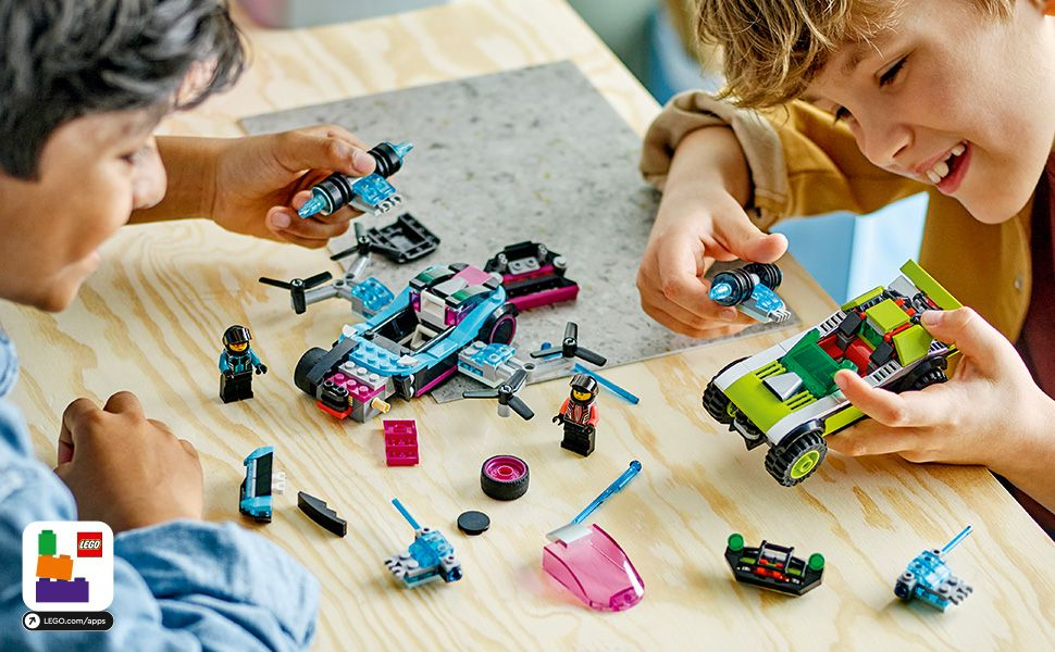 De l’action pied au plancher – Les enfants peuvent recréer l’action du jeu vidéo LEGO® 2KDrive ou mettre en scène leurs propres courses avec le set Les voitures de course modifiées LEGO City (60396)
