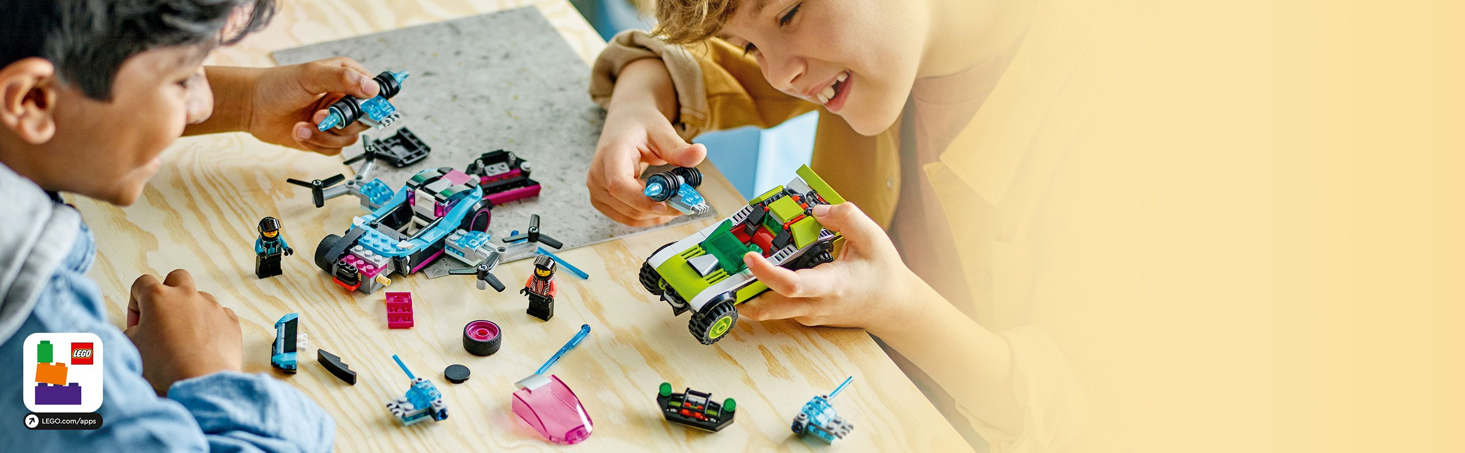 Que contient la boîte ? – Tout ce dont les enfants ont besoin pour construire une voiture de course et un tout-terrain personnalisables, des éléments de perfectionnement tels que des propulseurs et des hélices et 2 minifigurines de pilotes
