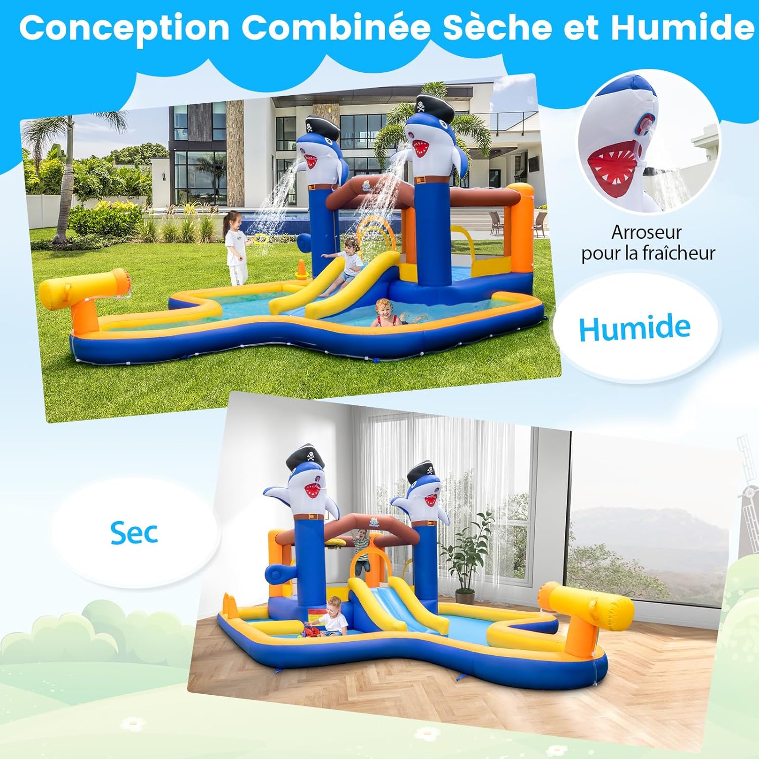 - Cadeau idéal pour vos enfants : Mesurant 578 x 408 x 250 cm, ce château gonflable spacieux et amusant peut être apprécié par plusieurs enfants jouant ensemble. Les enfants et leurs amis peuvent partir ensemble à l'aventure dans un parc aquatique et développer leur coordination œil-main et leurs aptitudes physiques tout en s'amusant.