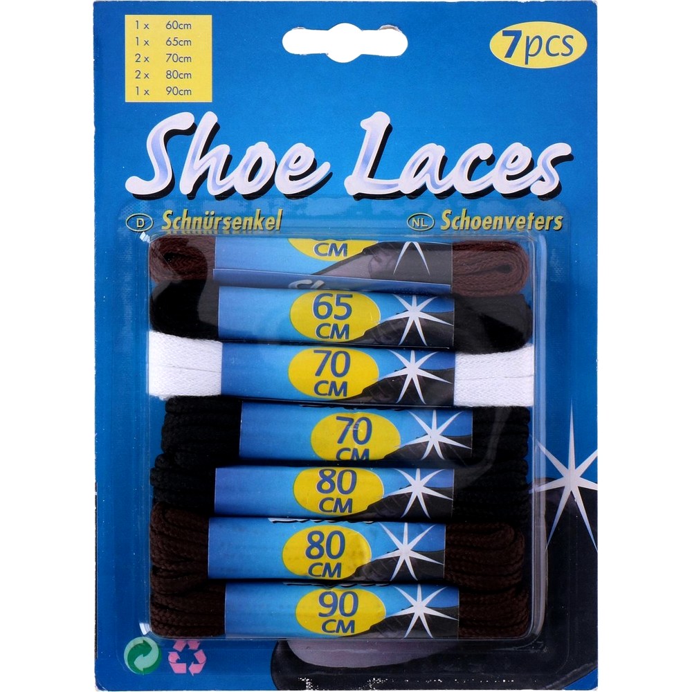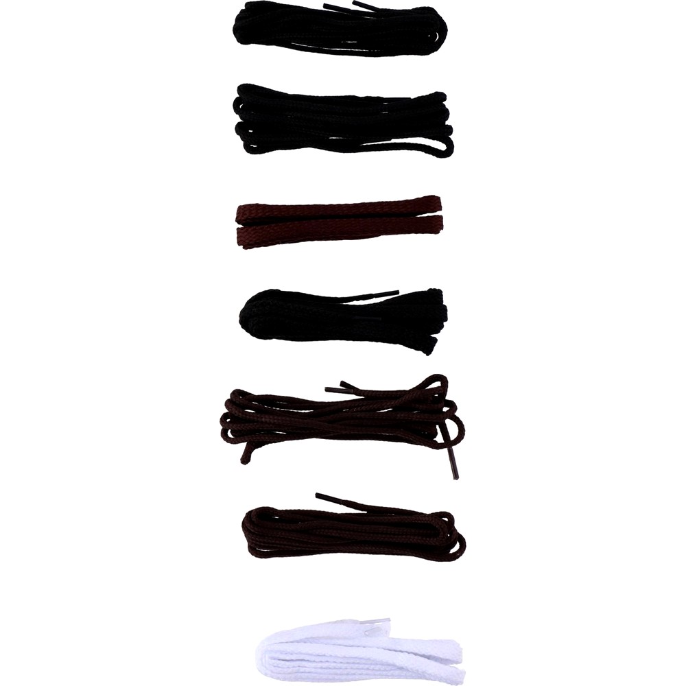 L'ensemble est composé de sept paires de lacets . Couleur : marron , noir , blanc Matière : coton Longueur : 60-90 cm Contenu : 1 paire de lacets plats - 60 cm 1 paire de lacets plats - 65 cm 1 paire de lacets plats - 70 cm 1 paire de lacets ronds - 70 cm 2 paires de lacets ronds - 80 cm 1 paire de lacets ronds - 90 cm