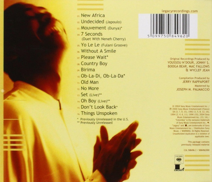 | Liste des pistes | 1.01 . new africa - Youssou N'Dour1.02 . undecided (japoulo) - Youssou N'Dour1.03 . mouvement (dunya) - Youssou N'Dour1.04 . 7 seconds - Youssou N'Dour1.05 . yo le le (fulani groove) - Youssou N'Dour1.06 . without a smile - Youssou N'Dour1.07 . please wait - Youssou N'Dour1.08 . country boy - Youssou N'Dour1.09 . birima - Youssou N'Dour1.10 . ob-la-di, ob-la-da - Youssou N'Dour1.11 . old man - Youssou N'Dour1.12 . no more - Youssou N'Dour1.13 . set (live) - Youssou N'Dour1.14 . oh boy (live) - Youssou N'Dour1.15 . don't look back - Youssou N'Dour1.16 . things unspoken - Youssou N'Dour |