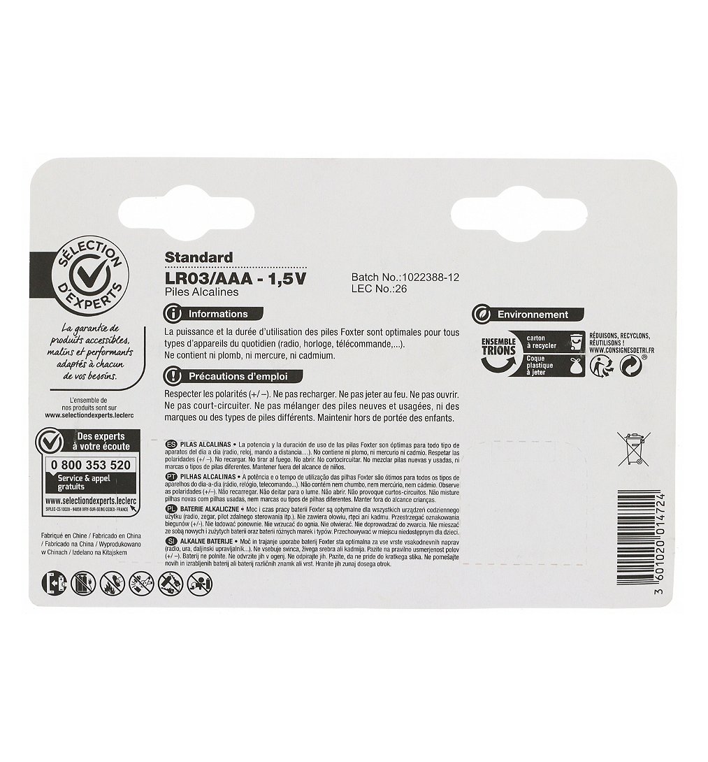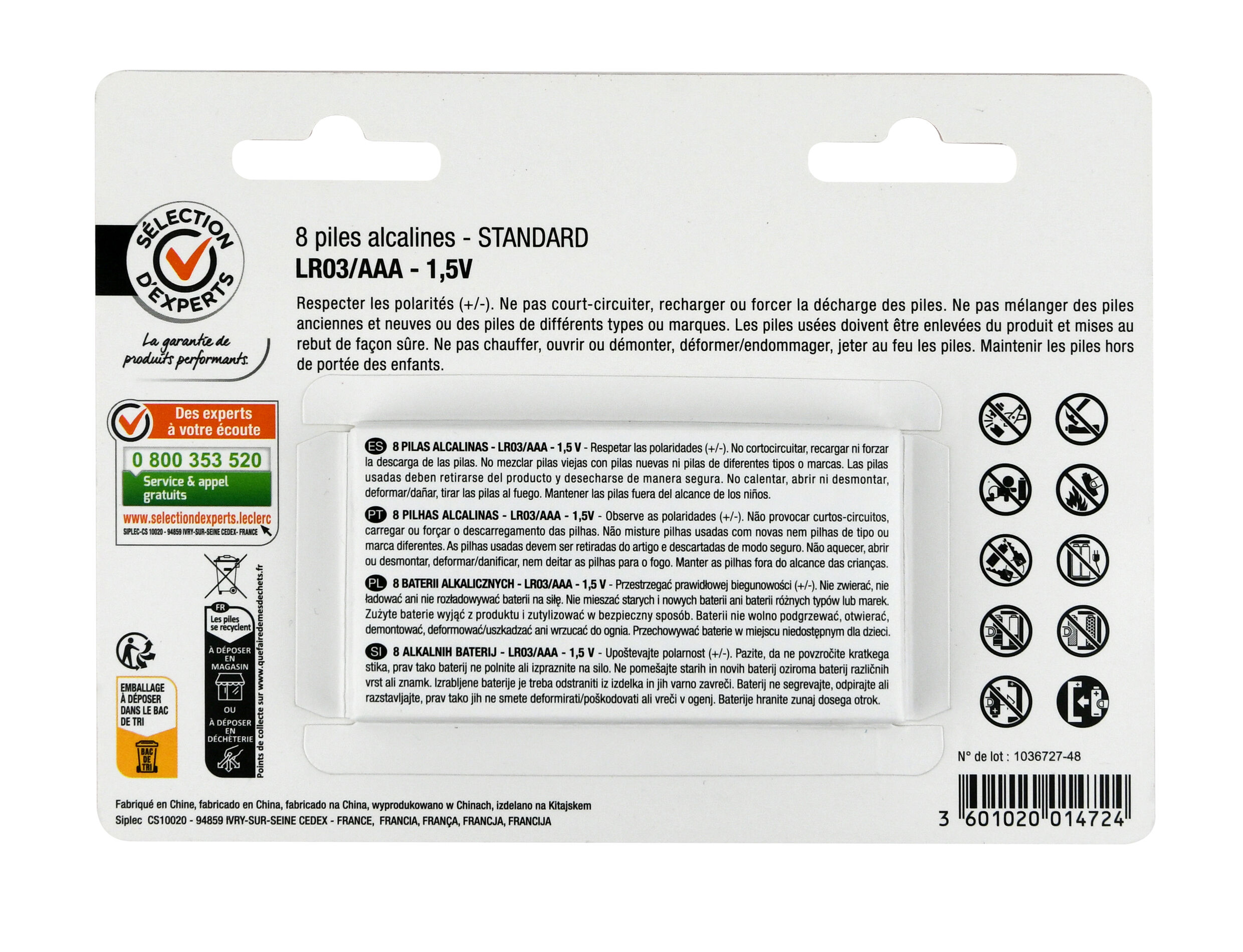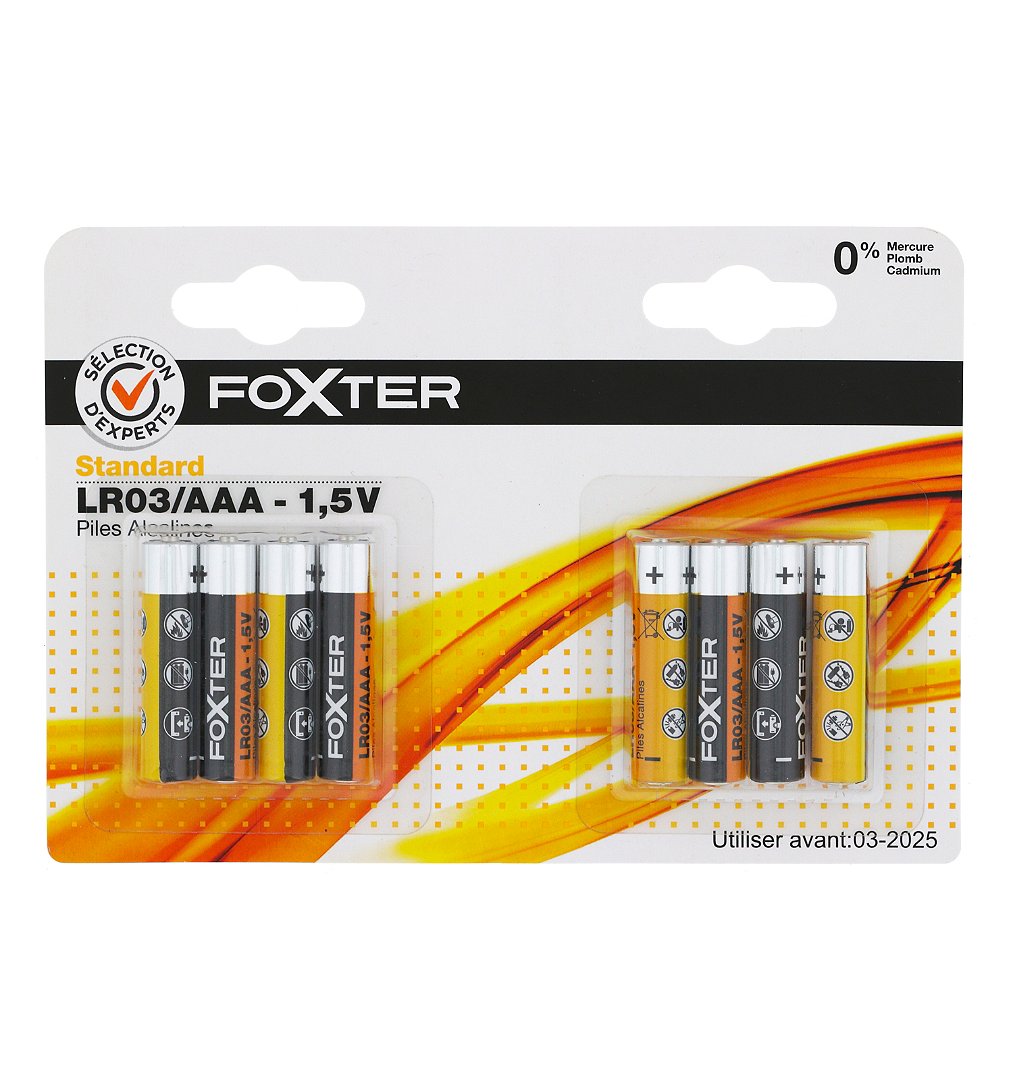 | Libellé | 8 piles alcalines LR03/AAA 1,5V - Standard - Sélection d'Experts - Foxter |