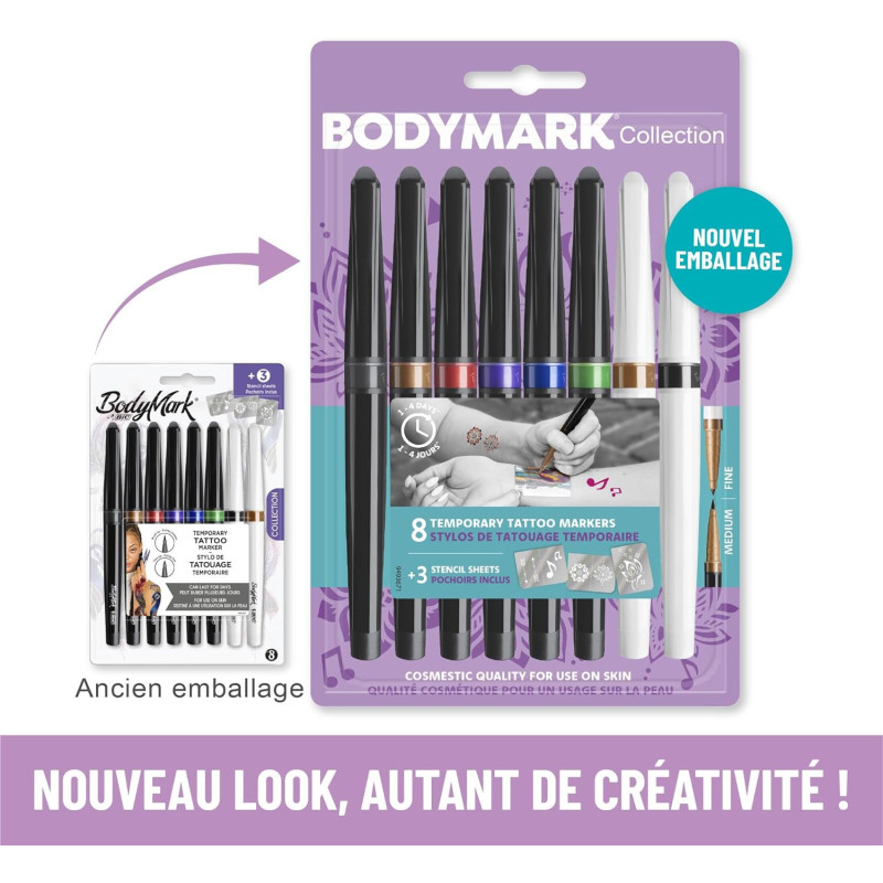 | Libellé | 8 stylos de tatouage temporaire + 3 pochoirs - Assortis couleurs - BIC - BodyMark |