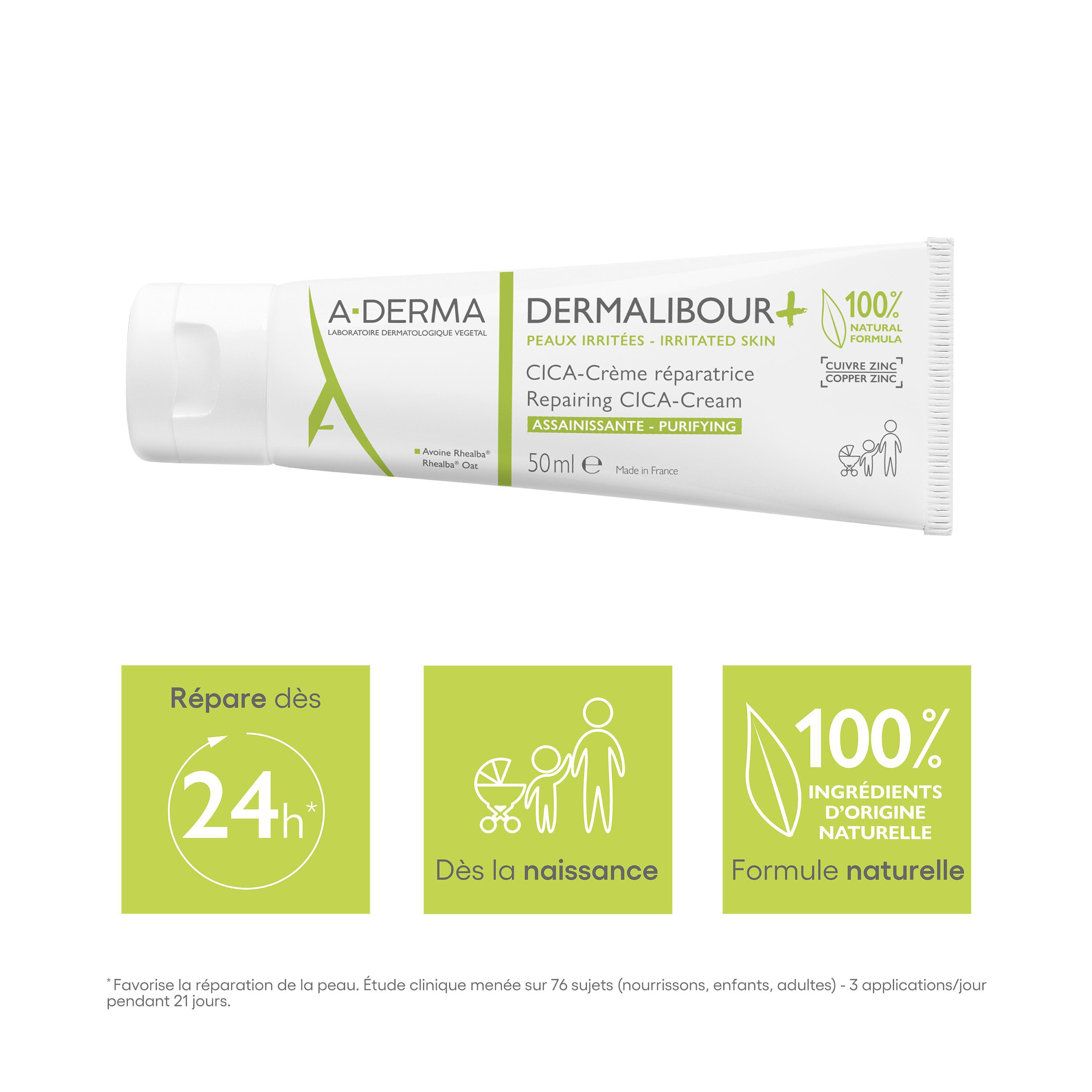 DERMALIBOUR+ CICA-Crème réparatrice assainissante apaise immédiatement, répare* et assainit les peaux irritées de toute la famille dès la naissance.