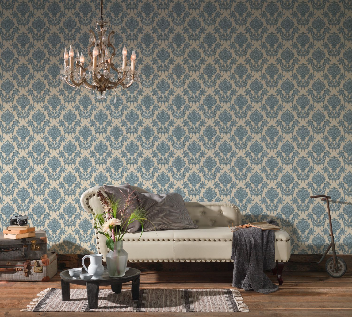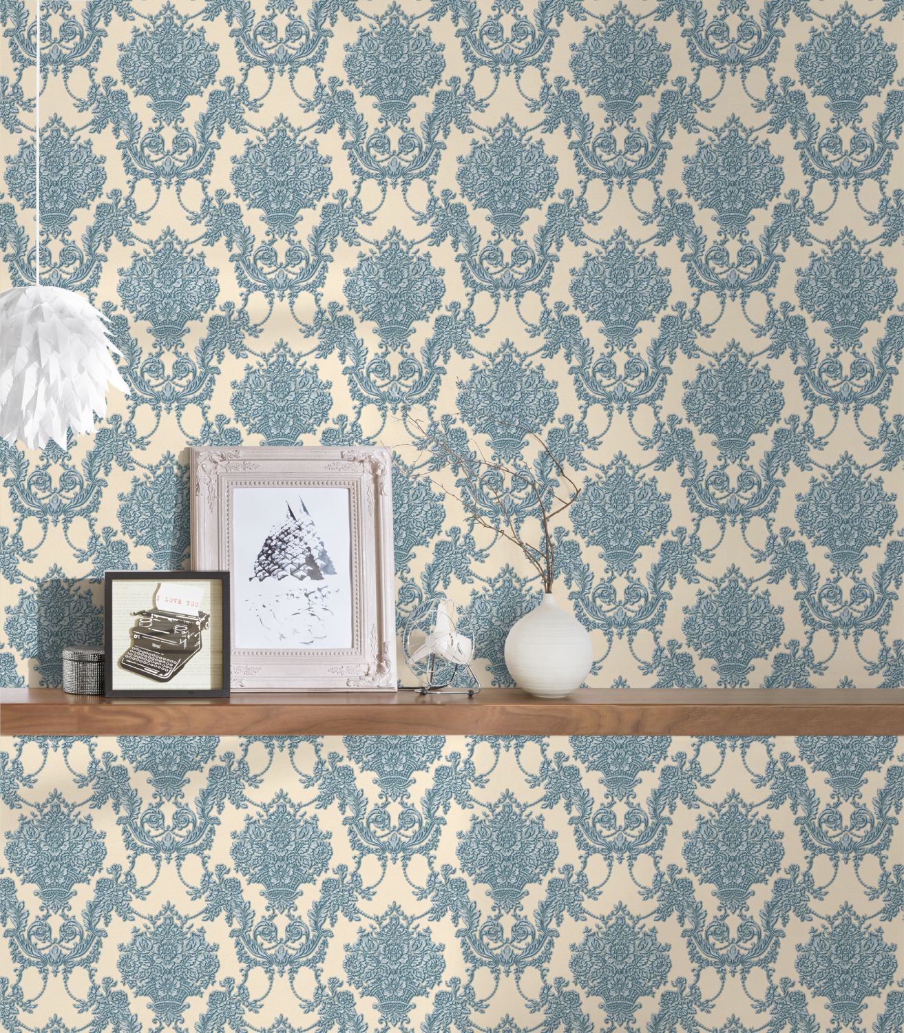 Habillez vos murs avec élégance grâce à ce papier peint classique baroque en bleu, argent et couleur sable. Ce papier peint créera une ambiance harmonieuse et stylée dans votre pièce. Laissez-vous charmer par ce beau revêtement mural!