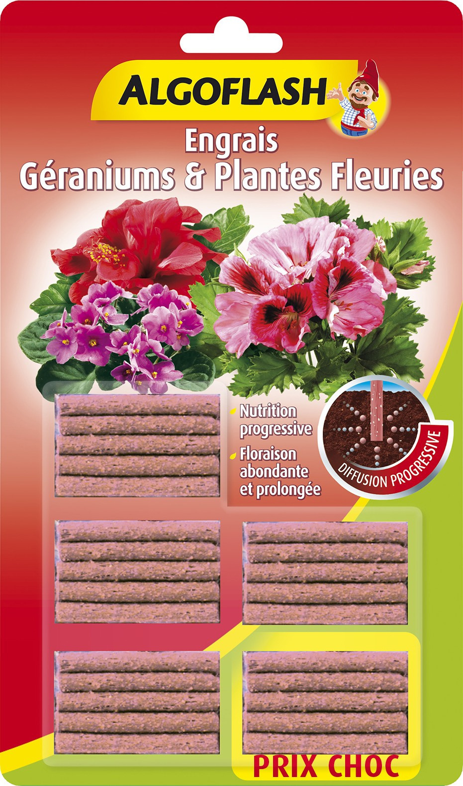 Engrais complet en bâtonnets, avec magnésie, qui apporte tous les éléments nutritifs nécessaires à la croissance des plantes en pots et en jardinières pendant 3 mois environ. Il est parfaitement adapté à toutes les variétés de géranium (lierre et zonale) et à toutes les plantes à fleurs de balcons (pétunias, pensées...).
