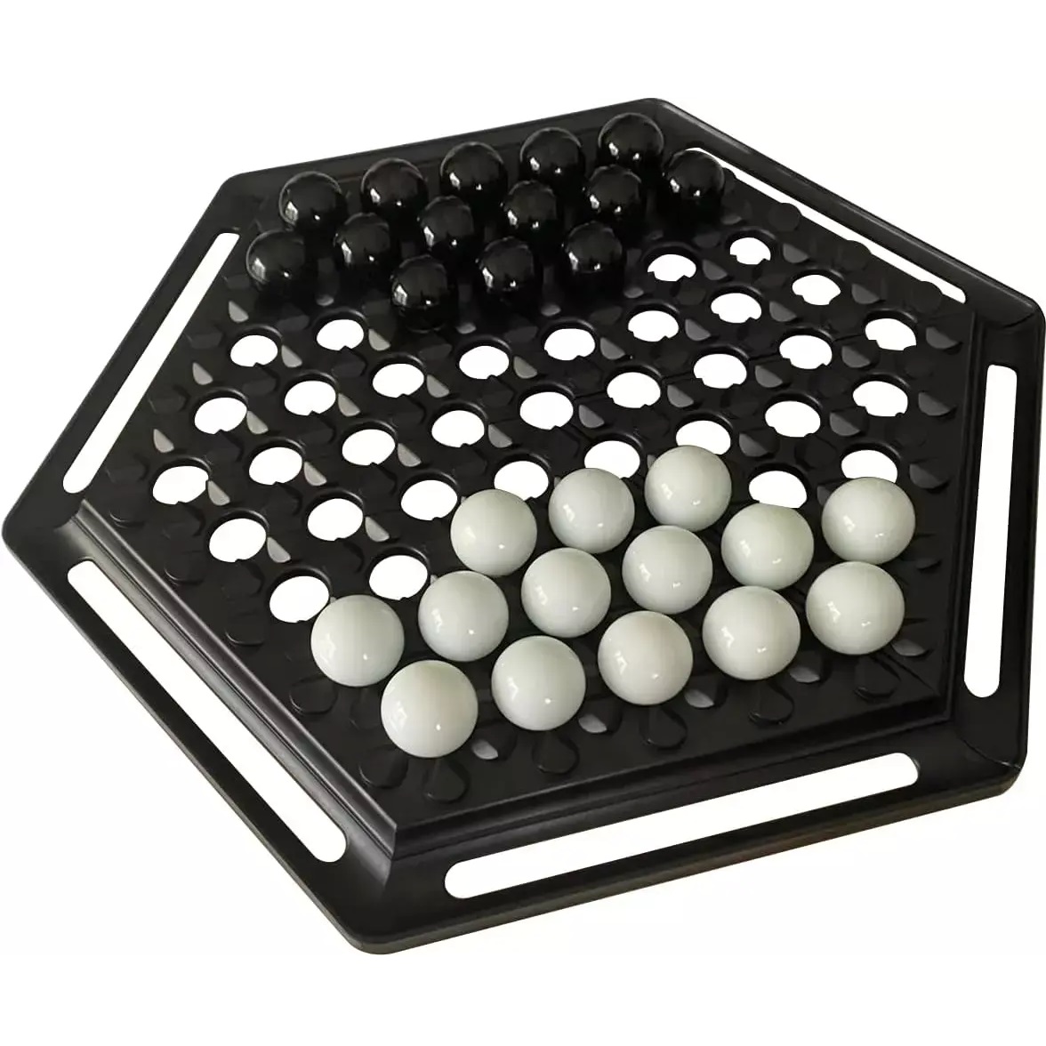 | La boîte contient | - 28 billes (14 noires et 14 blanches) - 1 plateau de jeu hexagonal - 1 règle du jeu |