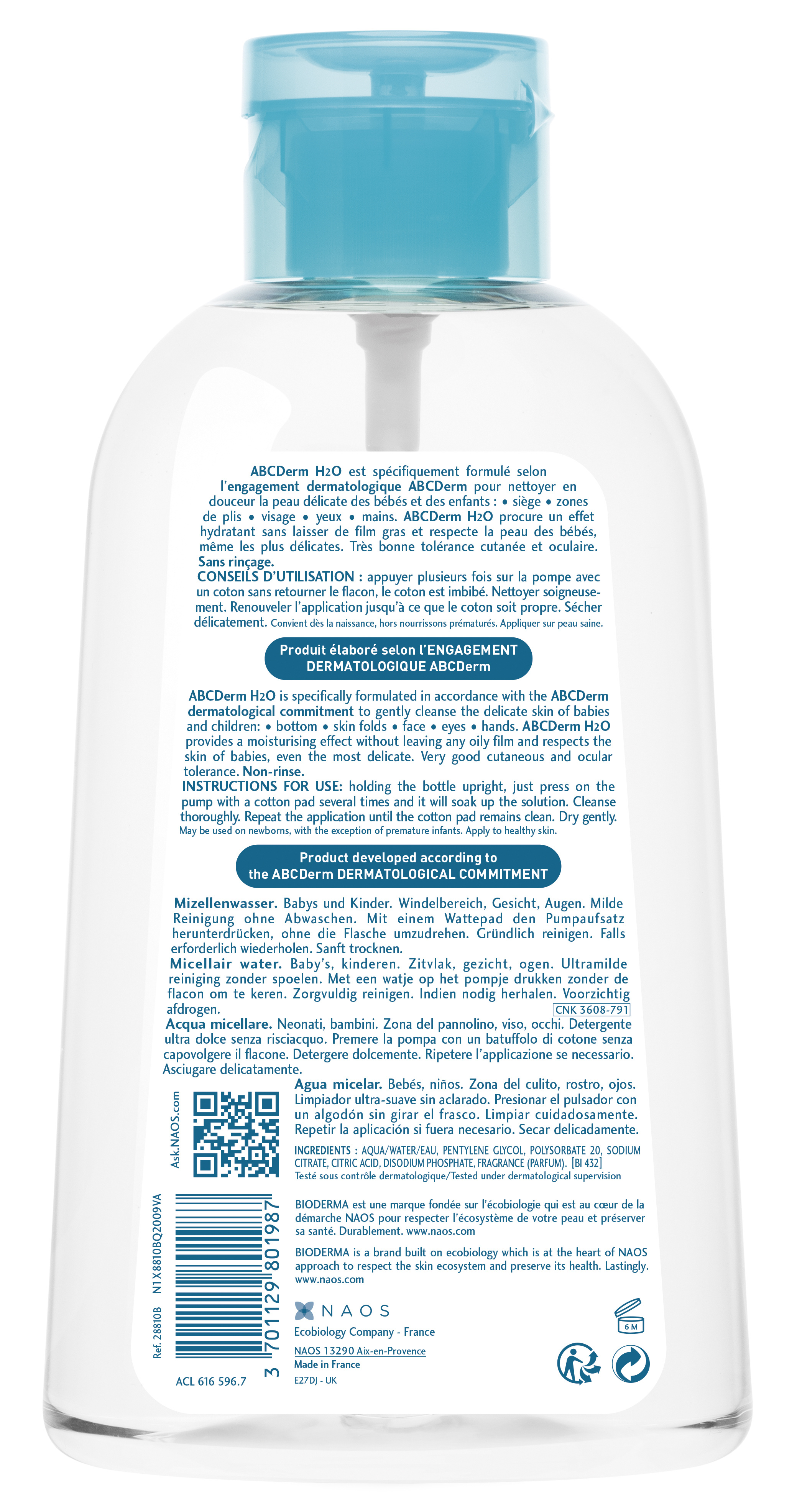 L'eau micellaire bébé ABCDerm H2O, à la formulation haute sécurité et haute tolérance, hydrate et protège la peau des bébés. Elle nettoie en douceur grâce à la Technologie Micellaire, qui vise à préserver et restaurer l’équilibre physiologique naturel de l'épiderme. Cette eau nettoyante bébé est à utiliser quotidiennement, pour le nettoyage et le change. Sans parfum ni ingrédients superficiels. Sans rinçage. Ce produit est formulé et fabriqué en France.