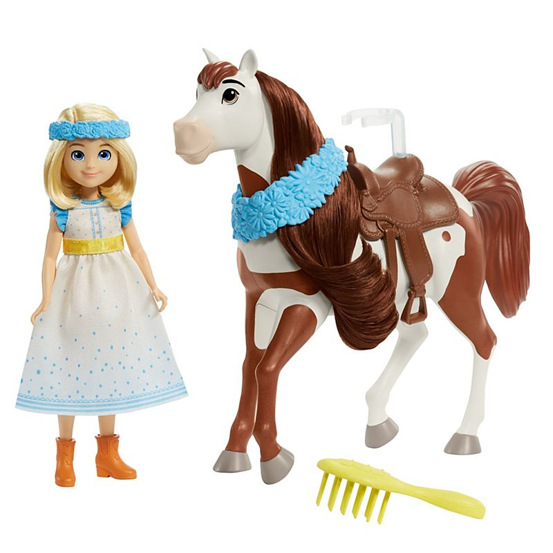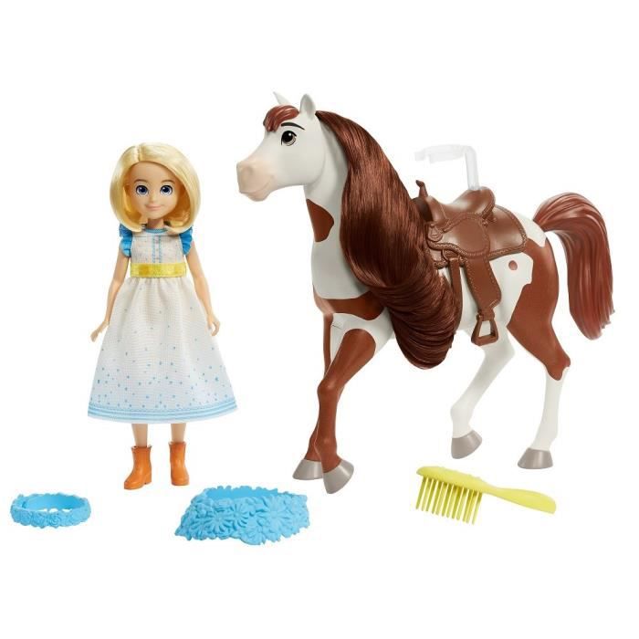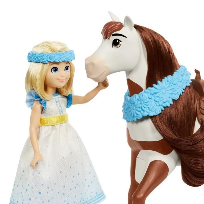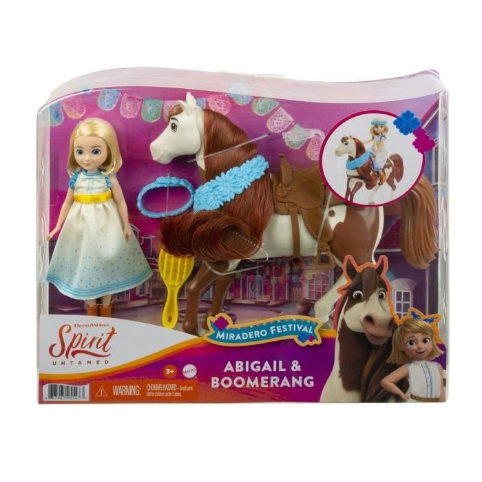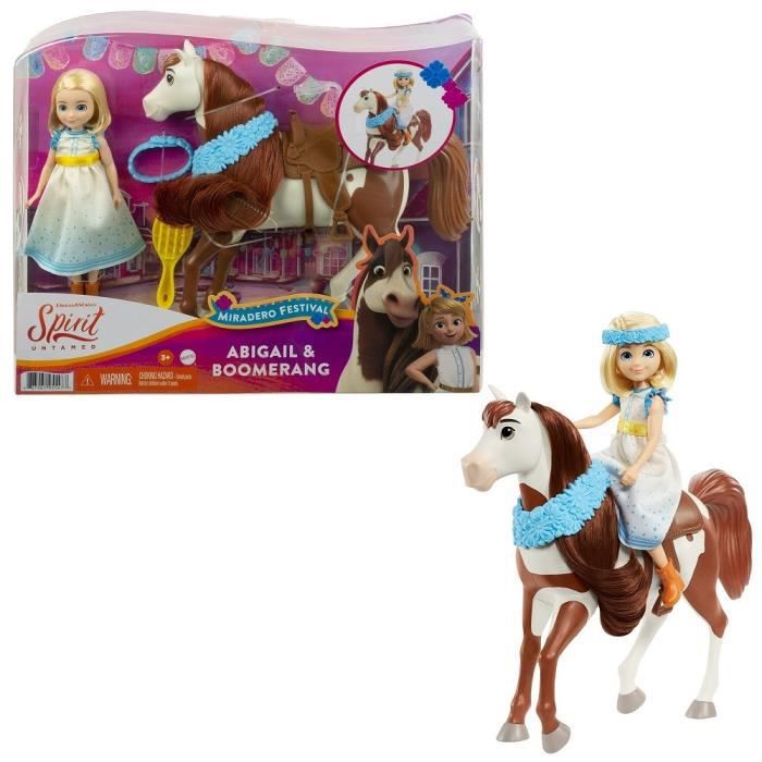 Vivez des histoires pleines d’amitié, de courage et d’aventure avec le film d’animation « Spirit : l’indomptable » de DreamWorks ! Inspirée de la fête de Miradero haute en couleur vue dans le film, cette poupée Abigaëlle (env. 18 cm) est fournie avec une brosse. Son cheval Boomerang (env. 20 cm) possède une longue crinière, une guirlande de fleurs et une selle pour profiter aussi des festivités ! La selle est dotée d’un système de fixation pour pouvoir installer la poupée dessus. Dès 3 ans.
