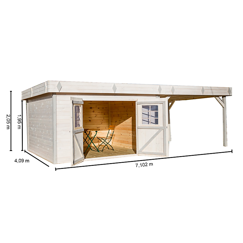 | Libellé | Abri avec terrasse couverte Madriers massifs 28 mm toit plat avec bac acier |