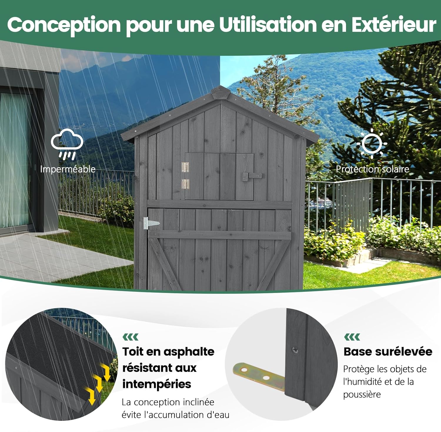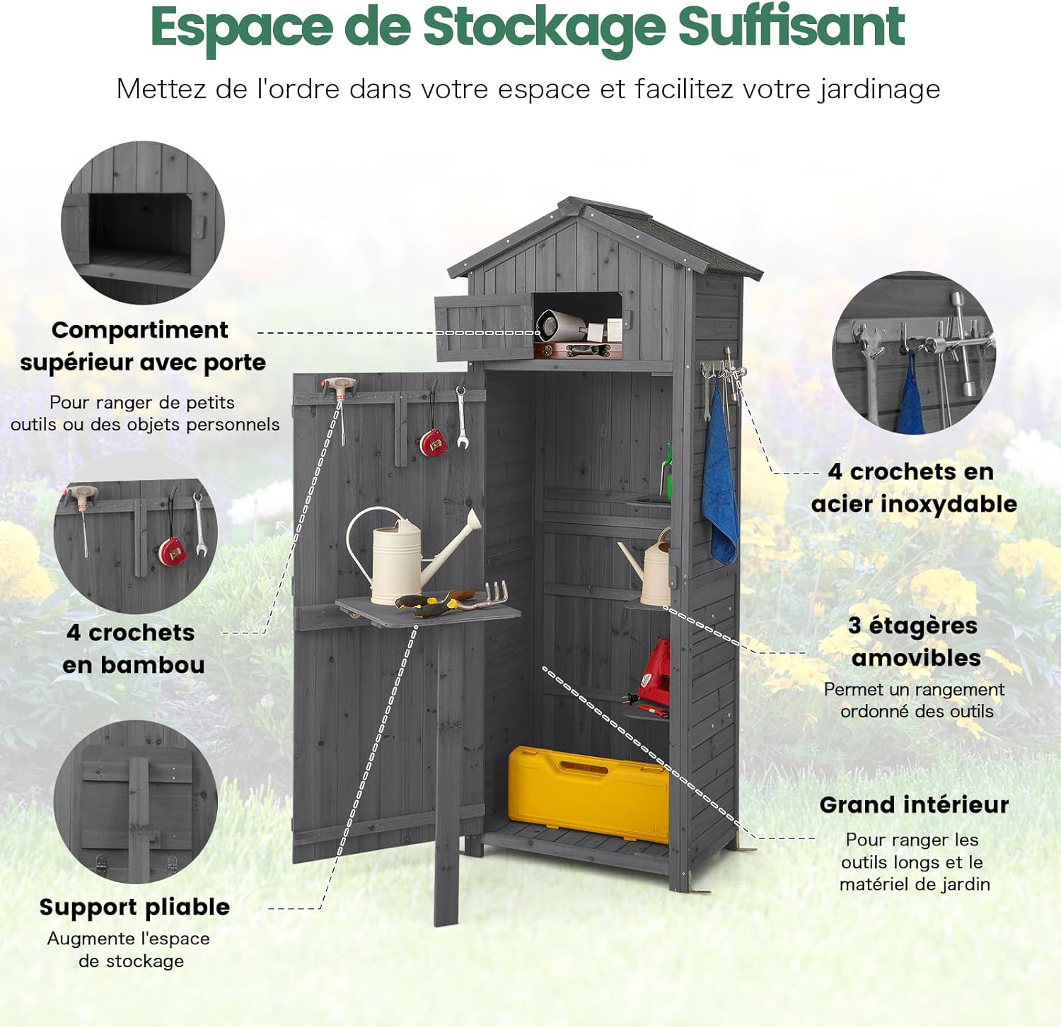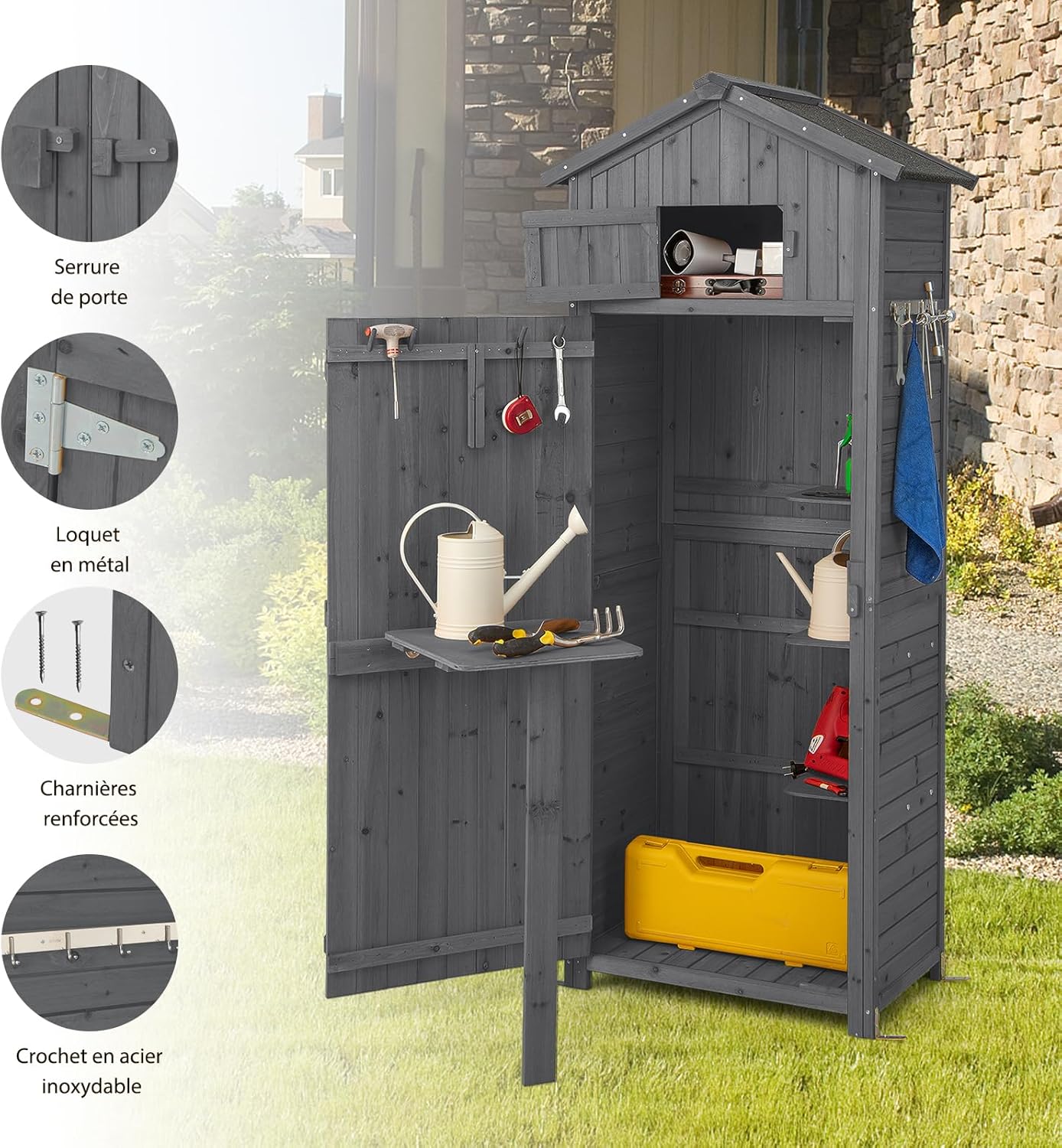 | Libellé | Abri de jardin 3 étagères amovibles, porte à loquet, tablette pliable, toit asphalte, crochets (Gris) |