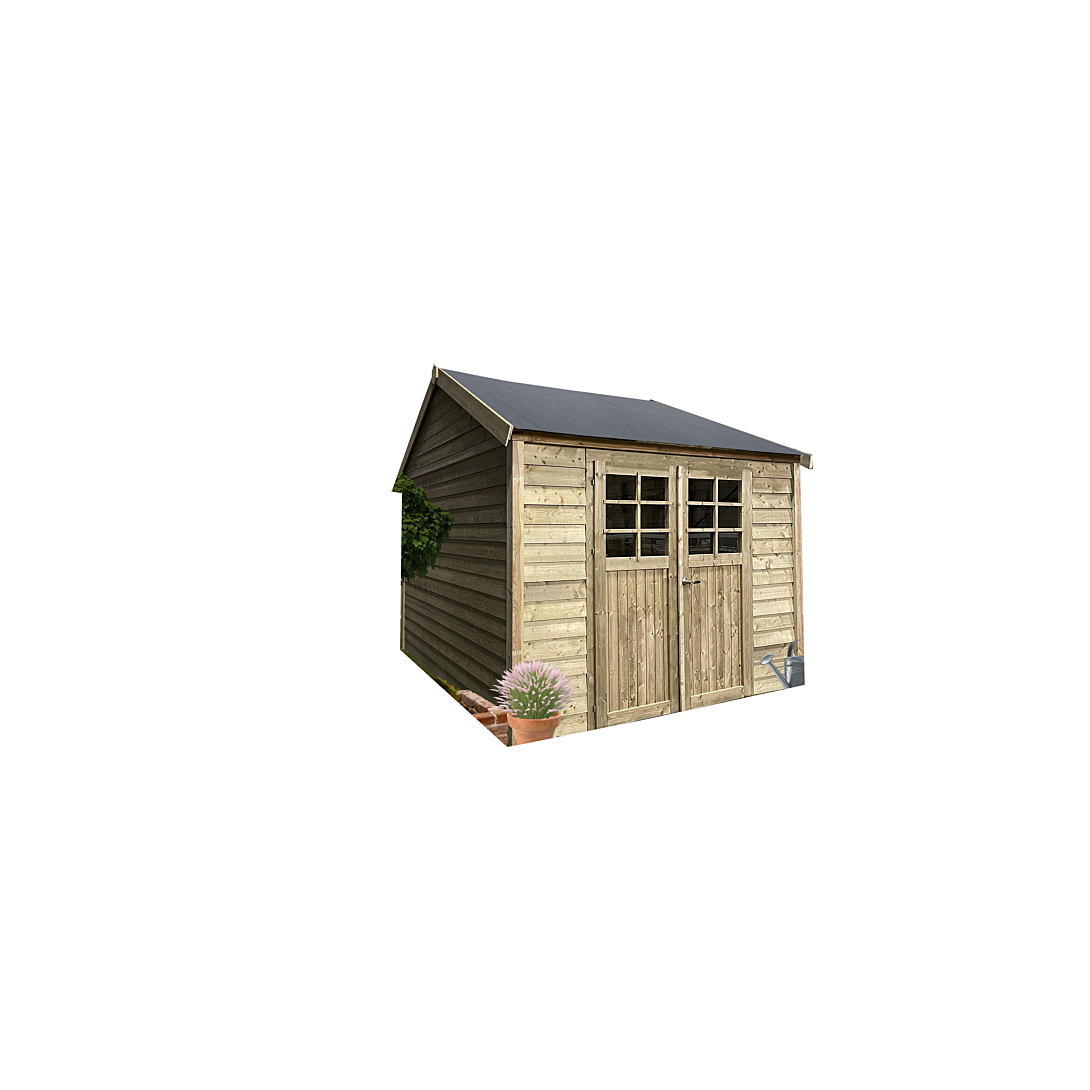 Cet abri Anneux en panneaux de 19 mm à assembler , traité en autoclave classe 3 , offre une surface de stockage utile de 8,07 m² , et une surface hors tout de 9,82 m² , il est equipé d'une porte double battante avec vitrage en verre minéral trempé , grilles de ventilation , barre de seuil en aluminium de 2 cm pour un accès facile , serrure à clés inox .