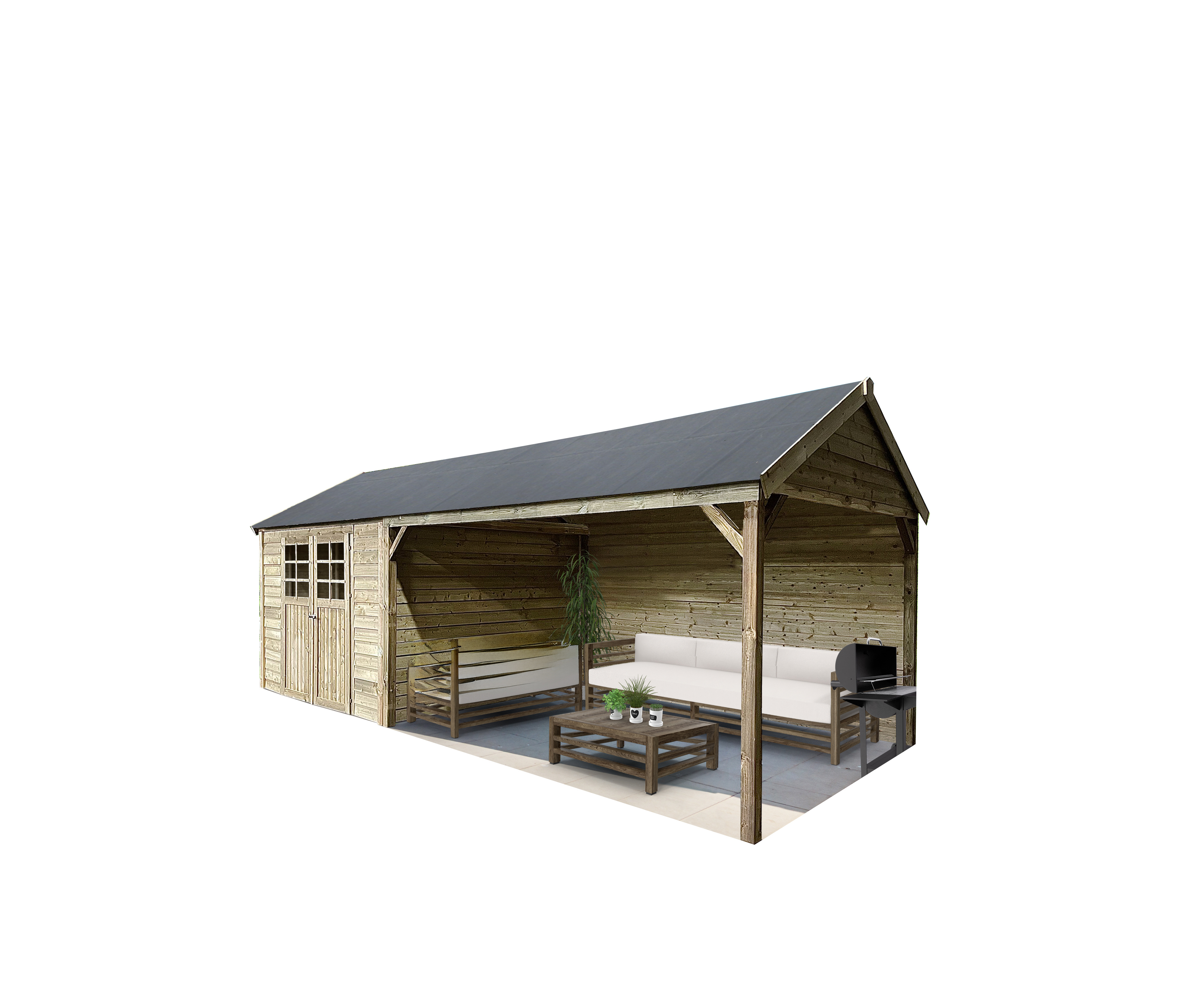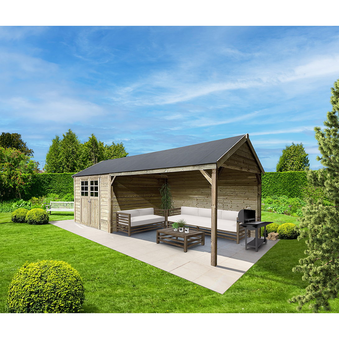 Abri de jardin Cambrai en bois traité en panneaux de 19mm. 2936 + 3948 x 2936mm