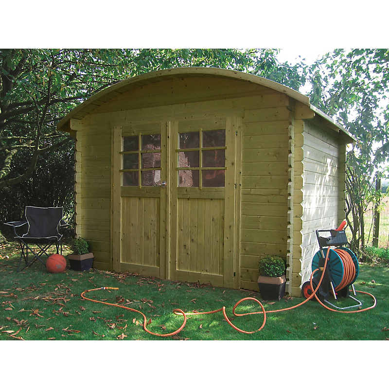 Abri de jardin Dainville I en bois traité en madriers de 28mm à emboîter. Dimensions au sol 2980 x 2380 mm soit 5.88 m² utile.