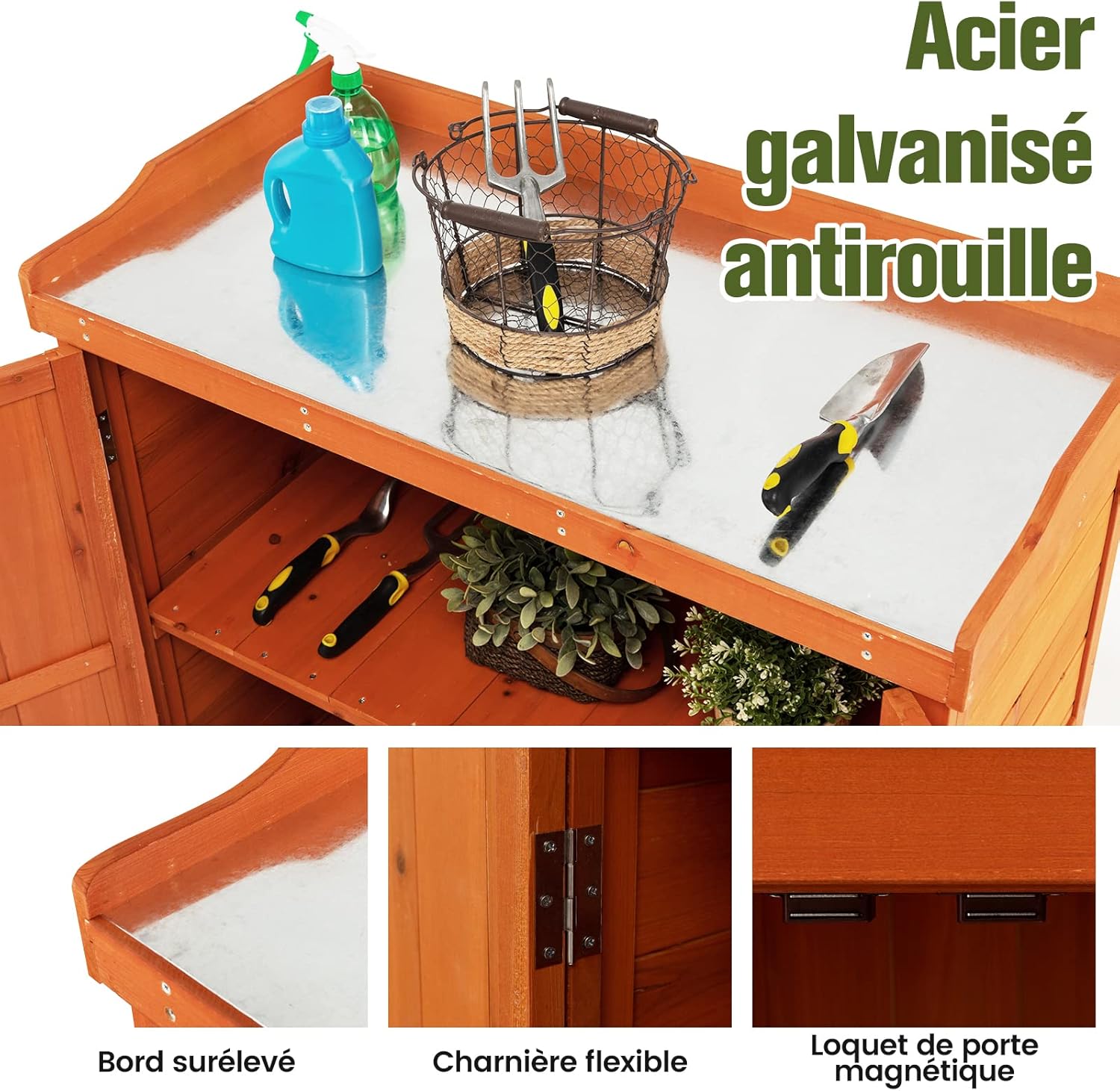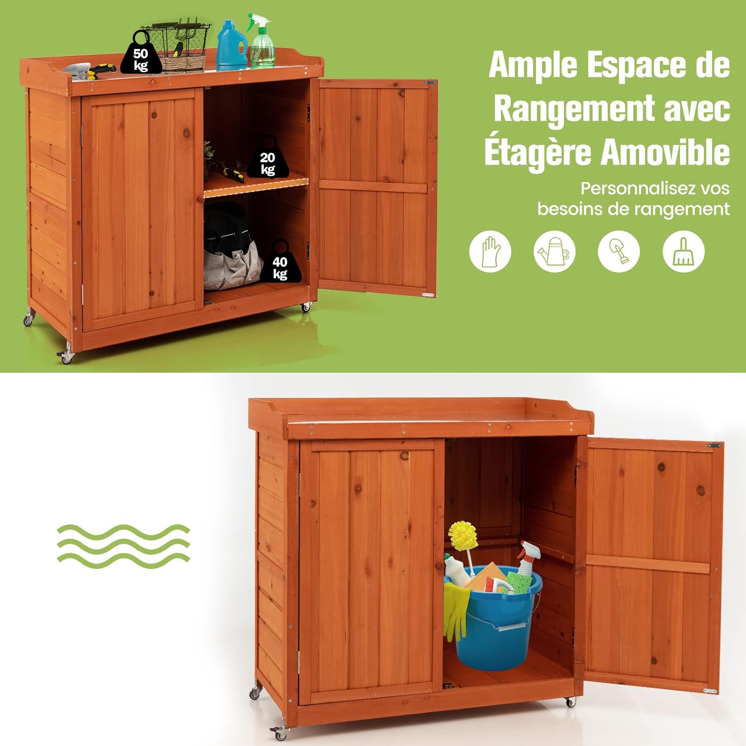 | Libellé | Abri de jardin en bois 2 en 1 avec porte, étagère amovible, 4 roues universelles, plateau en acier |