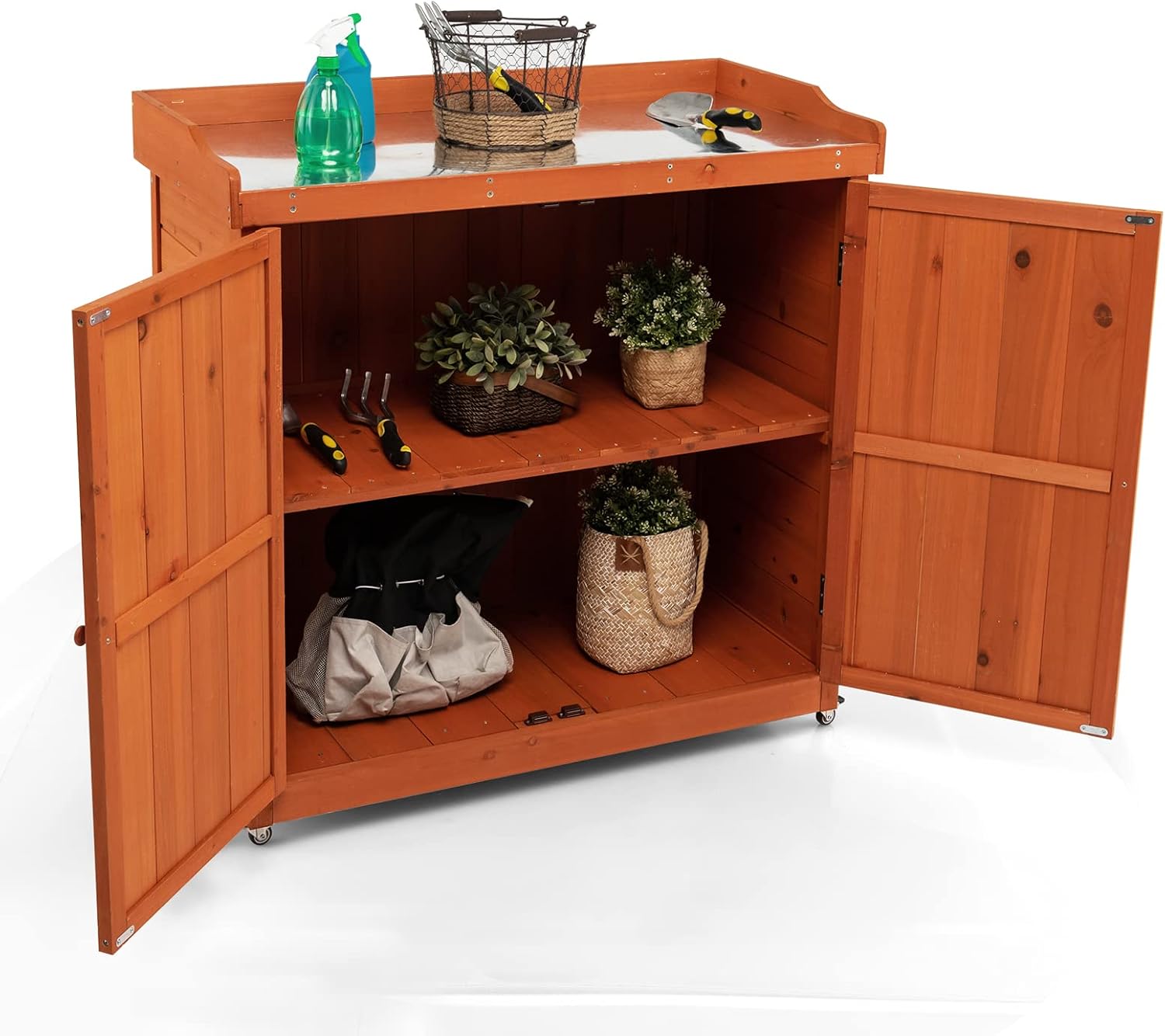Abri de jardin en bois 2 en 1 avec porte, étagère amovible, 4 roues universelles, plateau en acier