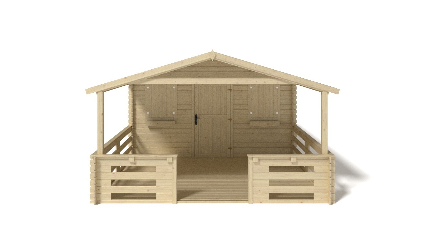 Abri de jardin en bois - 4x3 m + terrasse avec balustrade et avant-toit en bois - 20 m2 - DOM337+DOM17+DO